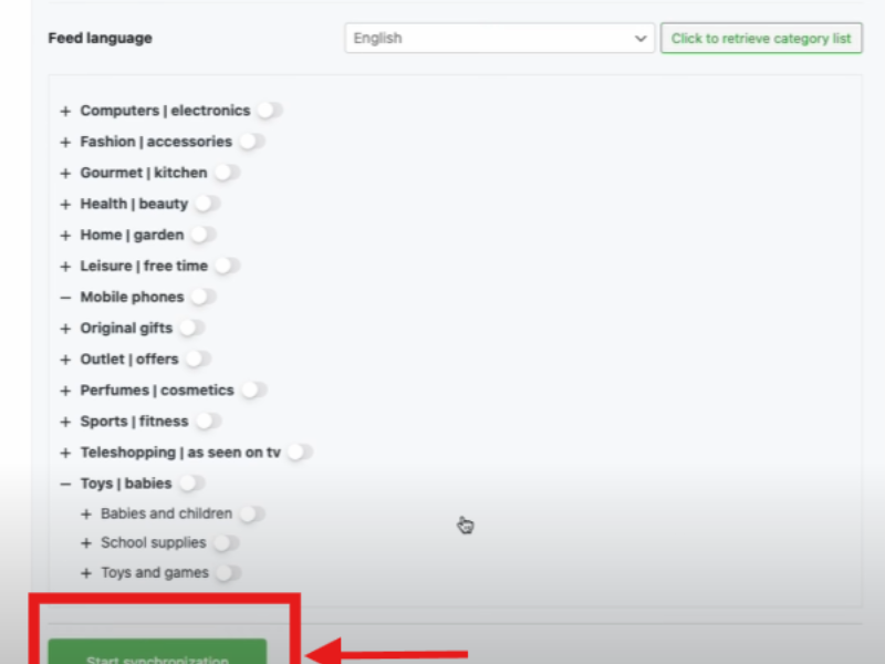 Với tài khoản BigBuy đã kết nối, hãy cài chọn danh mục sản phẩm phù hợp với cửa hàng của bạn. Sau đó bạn cần thao tác tùy chọn giá, chọn một trong những tùy chọn giá như RRP (giá bán lẻ khuyến khích), giá B2B và giá BigBuy.