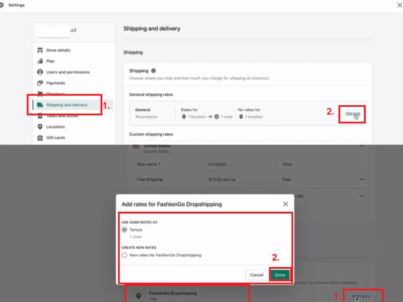 - Bước 2: Nhấp vào Quản lý, kéo xuống cuối trang và bật FashionGo Rates.