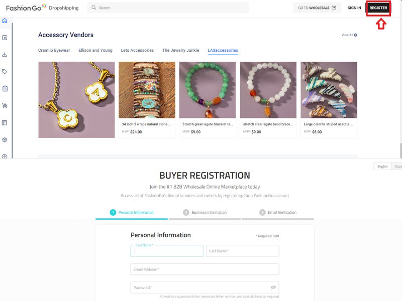 - Bạn truy cập trang web FashionGo và nhấp vào nút “Đăng ký” ở góc trên bên phải.