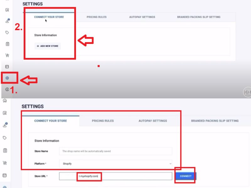 - Truy cập Cài đặt từ thanh bên, sau đó chọn Thêm cửa hàng mới. Nhập thông tin cửa hàng của bạn, bao gồm tên, nền tảng và URL (đảm bảo URL có myshopify.com). Khi hoàn tất, nhấp vào “Kết nối”.