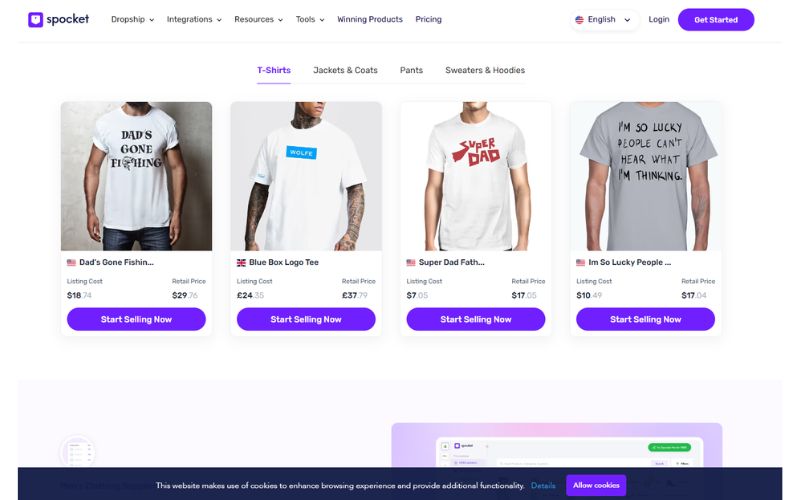 Spocket là nền tảng kết nối người bán với các nhà cung cấp chủ yếu từ Mỹ và EU, đảm bảo chất lượng sản phẩm và thời gian giao hàng nhanh chóng. Với hơn 60.000 người bán trên toàn cầu, Spocket cung cấp đa dạng mẫu mã áo phông, từ thiết kế đơn giản đến phong cách thời trang hiện đại. Thời gian giao hàng từ 2-5 ngày giúp cải thiện trải nghiệm của khách hàng. Spocket tích hợp dễ dàng với các nền tảng thương mại điện tử như Shopify, WooCommerce và BigCommerce, hỗ trợ quản lý cửa hàng hiệu quả. Các gói dịch vụ của Spocket bao gồm: