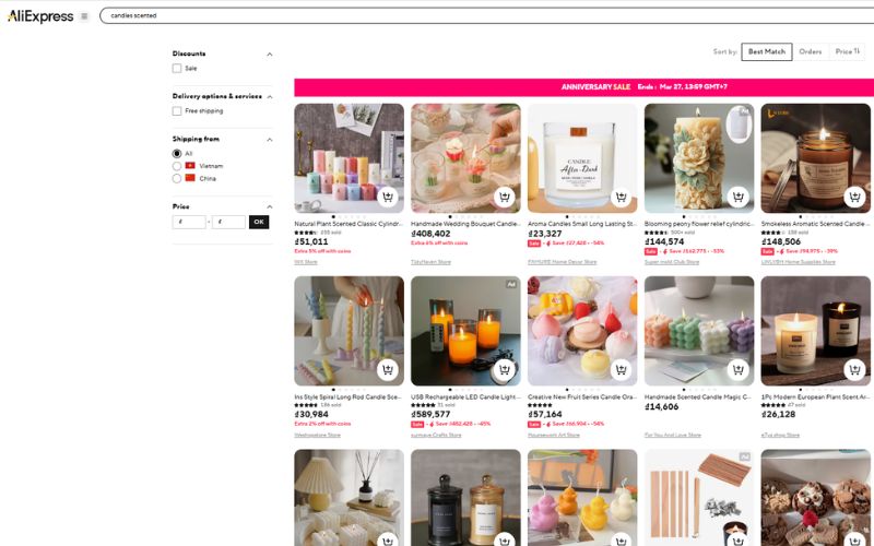 Đối với nến thơm, AliExpress nổi bật với các lựa chọn giá rẻ như nến tealight, nến ly thủy tinh hoặc nến thơm tinh dầu tự nhiên, giúp bạn dễ dàng nhập hàng với chi phí thấp và thử nghiệm thị trường mà không cần đầu tư lớn.