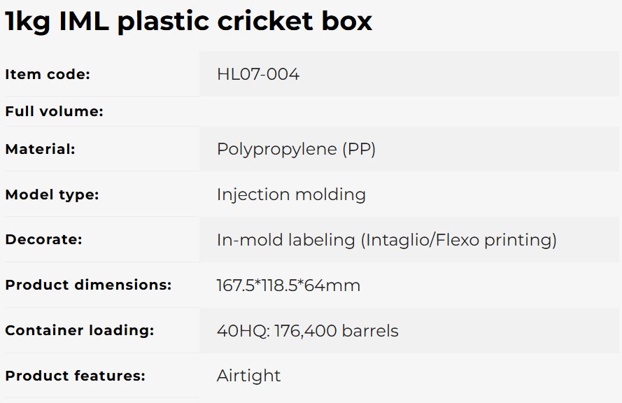 The Hobicorp 1kg IML Plastic Cricket Container is injection-molded from durable food-grade polypropylene (PP) and designed specifically for transporting and storing live insects. Featuring 278 precision-engineered ventilation holes on the container walls, base, and lid, it ensures optimal airflow to maintain freshness and vitality of live feed. Produced using high-speed, high-pressure injection molding and integrated In-Mold Labeling (IML) technology, this airtight yet breathable container offers consistent quality, customizable branding, and is ideal for pet food, reptile feed, and live insect packaging applications for global.