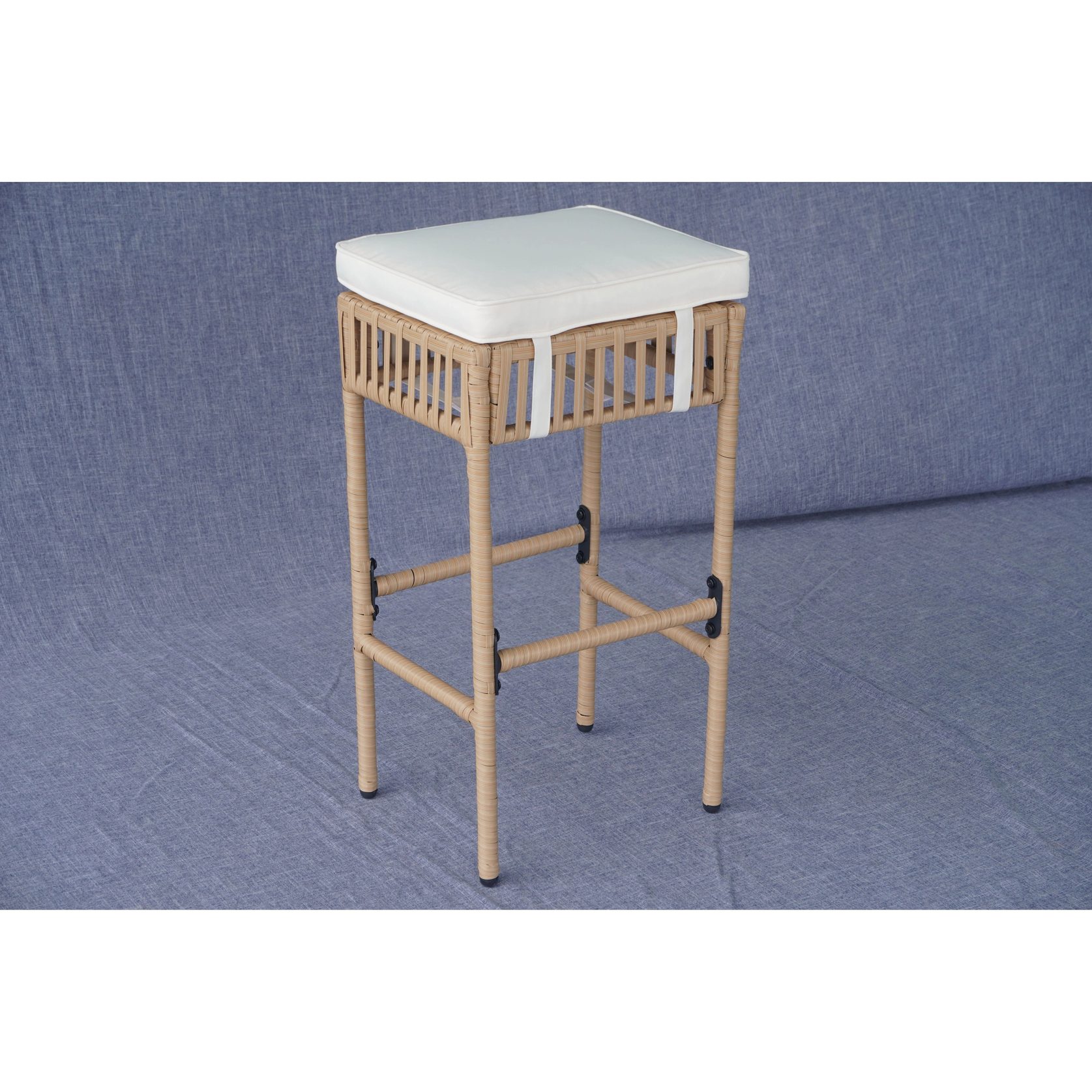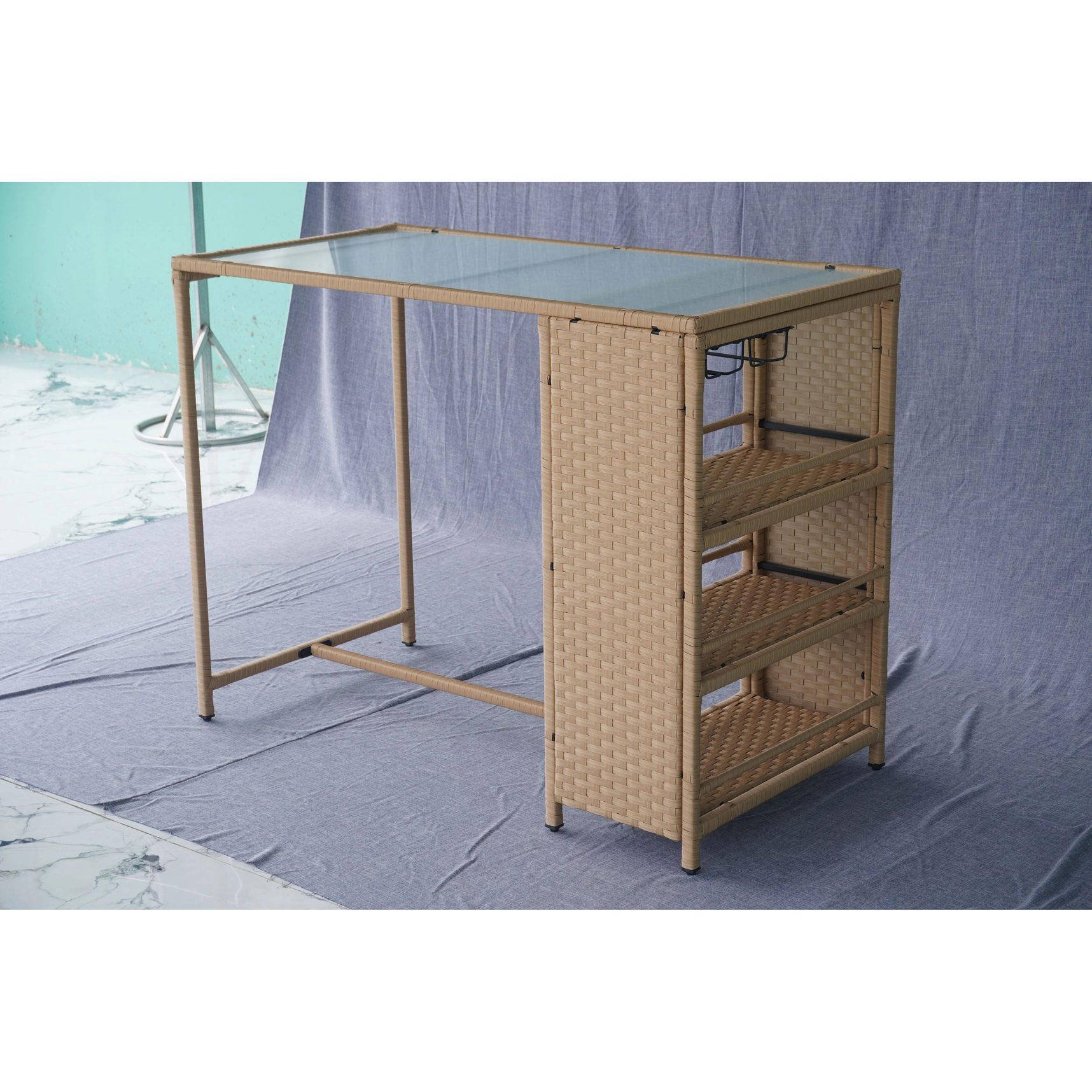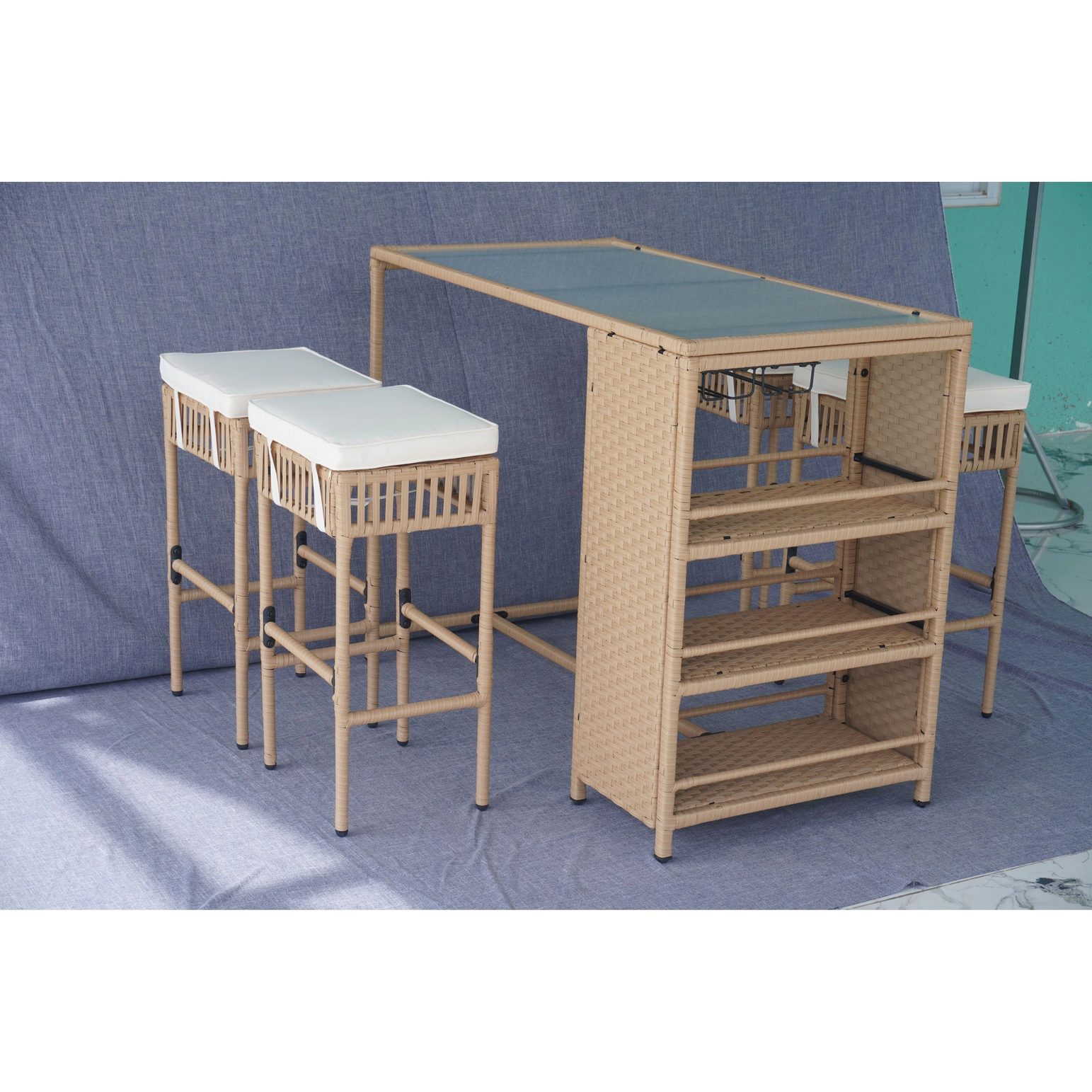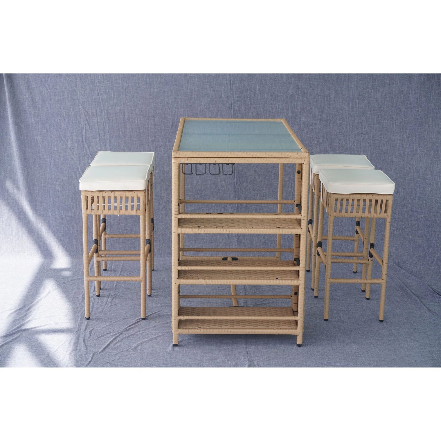 Elevate outdoor entertaining with this 5-piece bar-height rattan set—built for patios, poolside areas, garden lounges, and hospitality projects. Manufactured in Vietnam for export sourcing, the set includes a tempered glass-top bar table and four cushioned bar stools, crafted with handwoven PE rattan over a durable powder-coated steel frame for long-lasting performance. Integrated side shelving and under-table wine glass holders add practical storage for commercial and residential outdoor spaces.