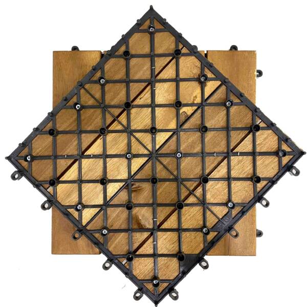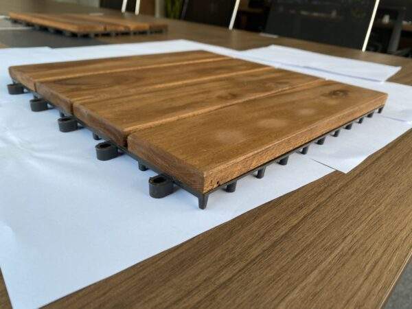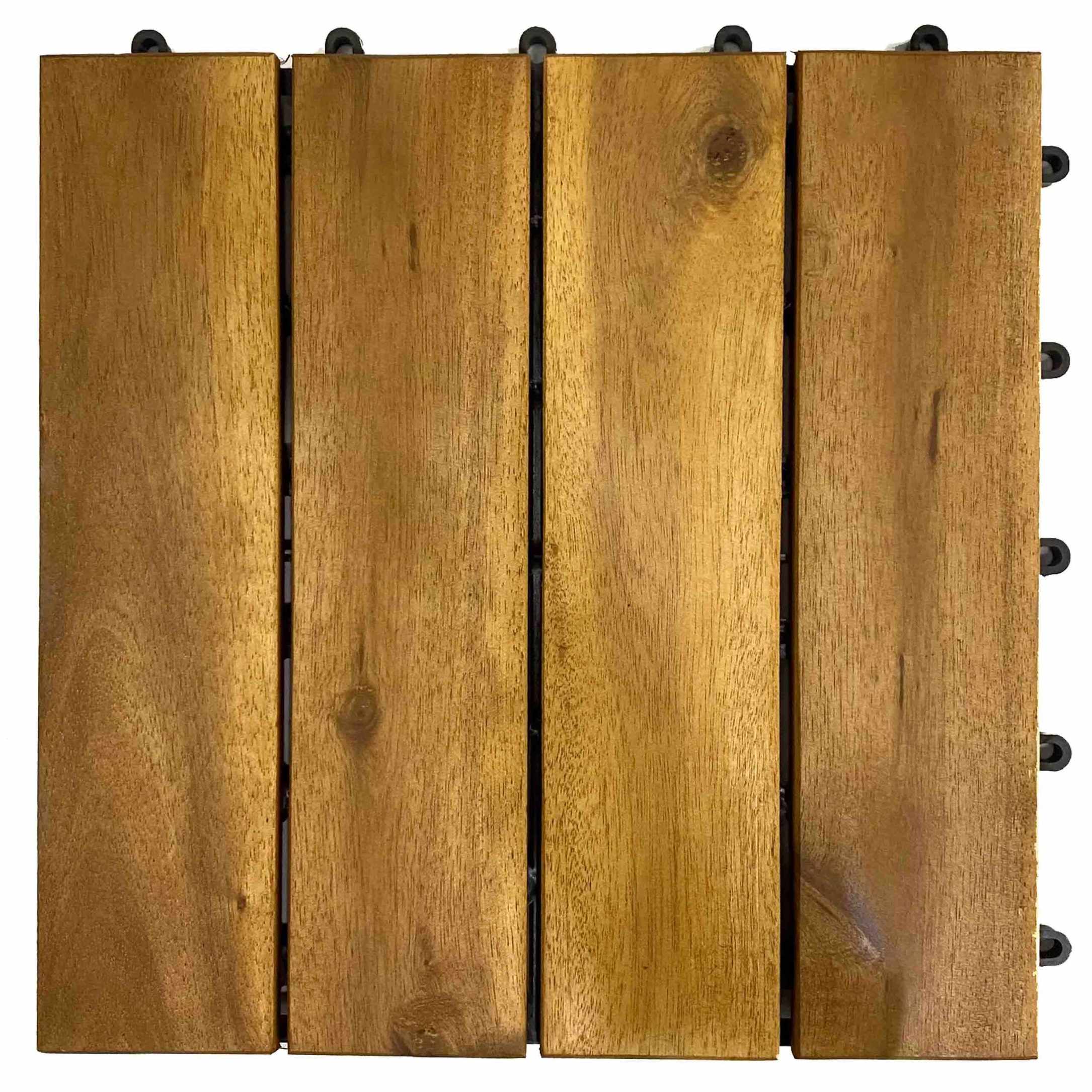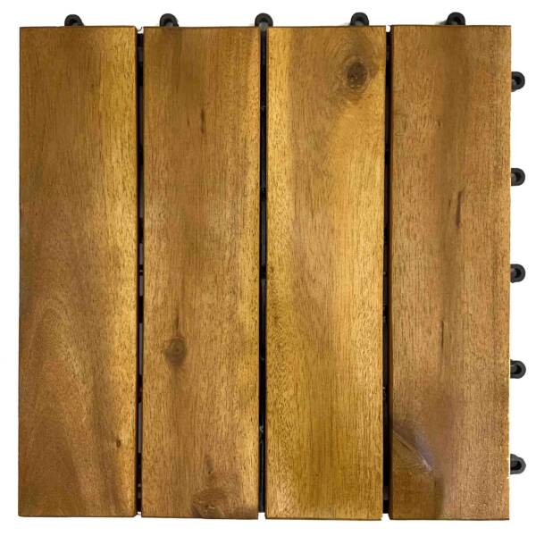 Interlocking deck tile in a 4-slat layout, designed as a cost-effective modular flooring option for balconies, patios, bathrooms, gardens, and seasonal display projects. Made in Vietnam using acacia wood with a plastic base, oil finished, and offered in trade-ready MOQ terms for wholesale sourcing.