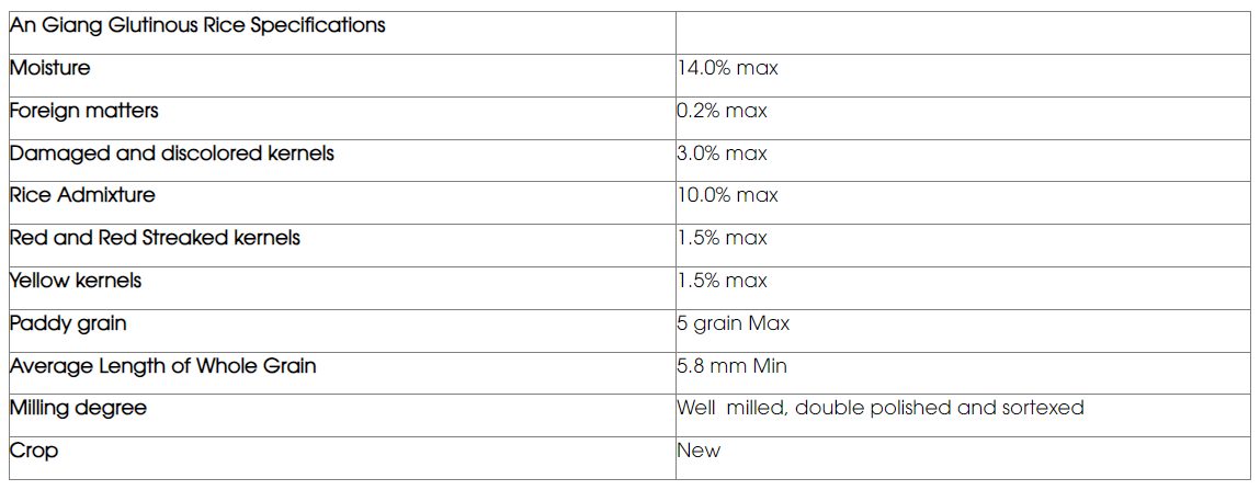 An Giang Glutinous Rice is a premium sticky rice variety widely cultivated in An Giang, Dong Thap, and other provinces of Vietnam’s Mekong Delta, with the Phu Tan planting area in An Giang recognized for producing the best quality. The grains are medium to slender in shape with an opaque, milky white color. When cooked, the rice becomes very soft and highly sticky, making it ideal for traditional Vietnamese cakes such as Banh Chung and Mooncakes, as well as other glutinous rice dishes. Grown in up to three crops per year, An Giang Glutinous Rice is produced in stable volumes and is widely exported to markets including China, the Philippines, and Malaysia.