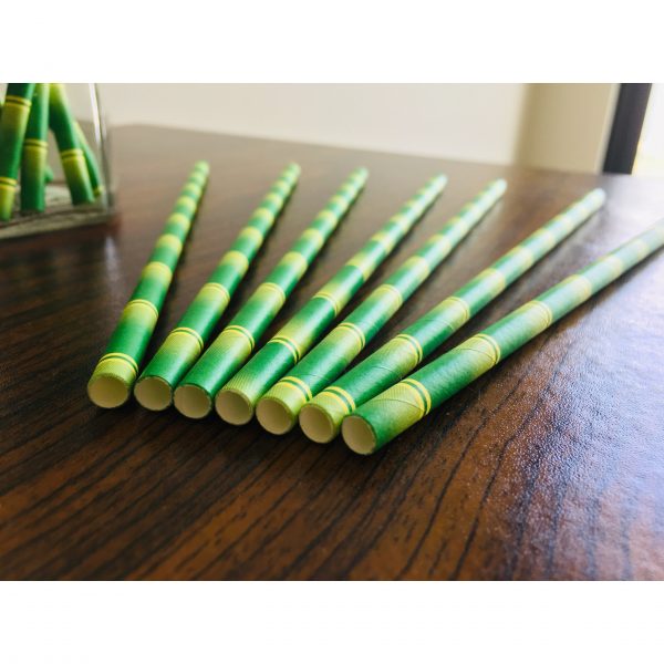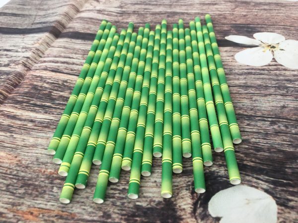 Manufactured in Vietnam, these bamboo design paper straws feature a green-and-yellow bamboo-inspired print for a distinctive, natural-themed presentation in beverage service, ideal for importers, distributors, cafes, hotels, and event planners sourcing eco-friendly drinkware accessories; made from printed paper (bamboo pattern) in 6mm x 197mm (approx. 19.5cm length), they are designed for 40–60°C drinks with typical in-cup performance of 3–4 hours, packed 25 straws per bag and 500 straws per box, with lead time typically 3–5 days depending on order volume and customization.