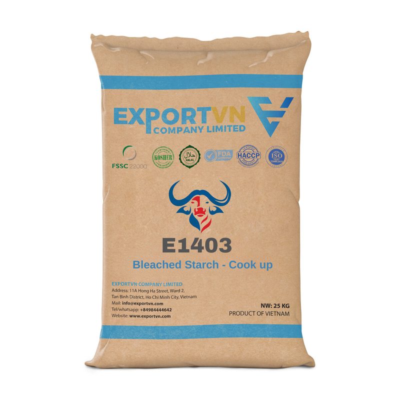Bleached Modified Starch INS 1403 is a food-grade modified starch processed to achieve a cleaner white, neutral appearance by removing natural color and impurities. Manufactured in Vietnam for industrial and export supply, this ingredient is used as a thickener, stabilizer, and binder to improve texture uniformity and visual quality in processed foods such as sauces, soups, and instant mixes. It supports consistent viscosity, product stability, and shelf-life performance for food manufacturers and ingredient distributors sourcing functional starch solutions.