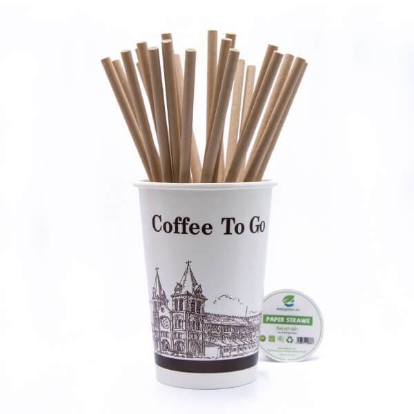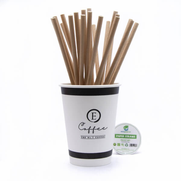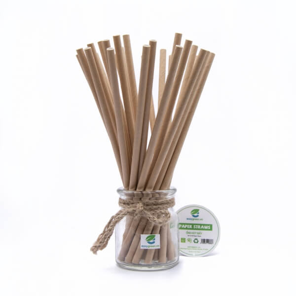 Brown kraft paper straws manufactured in Vietnam by Easy Green and supplied to export markets including the EU, USA, and Australia, offering a premium natural look widely used alongside white paper straws for modern F&B concepts; made from 3-layer EU-origin virgin paper with US-imported food-grade adhesive and plant-based inks (no PE) for safe, fully biodegradable use, delivering strong rigidity for both iced and hot beverages with 3–5 hours of normal use without disintegration; standard 197mm length with Ø6/Ø8/Ø12mm options, packed 500 pcs per kraft paper box, and available for OEM/private-label customization (size, color, and logo printing) for international importers, distributors, and hospitality buyers sourcing bulk volumes.