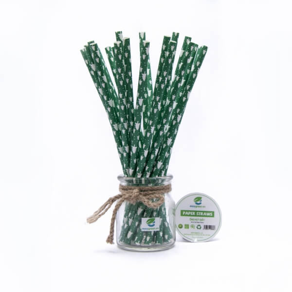 Seasonal Christmas tree–themed paper straws designed for year-end promotions, holiday parties, and festive F&B concepts, produced by Easy Green in Vietnam using 3-layer EU-origin virgin paper, US-imported food-grade adhesive, and plant-based inks (no PE) for safe, fully biodegradable use; suitable for both hot and cold beverages with strong structure that resists disintegration and delivers 3–5 hours of normal use, available in standard 197mm length with Ø6/Ø8/Ø12mm options and customizable sizes, colors, and branding for importers, distributors, and beverage chains sourcing bulk seasonal items.