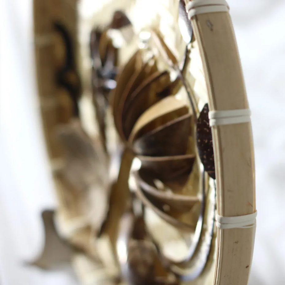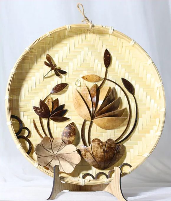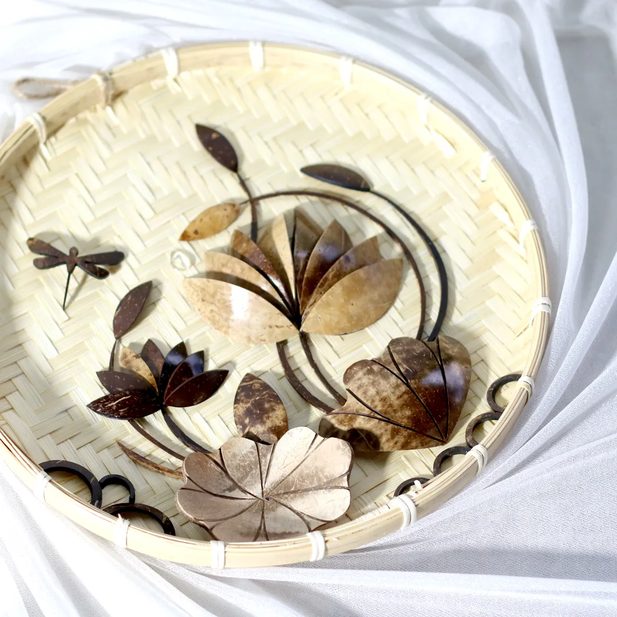 Made in Vietnam, this handmade wall hanging combines natural coconut shell inlay with a traditional bamboo sieve base to create a distinctive, eco-friendly décor accent for homes, offices, hotels, and resorts—ideal for importers and B2B buyers sourcing artisan wall décor with wholesale supply and customization options for patterns/lettering.