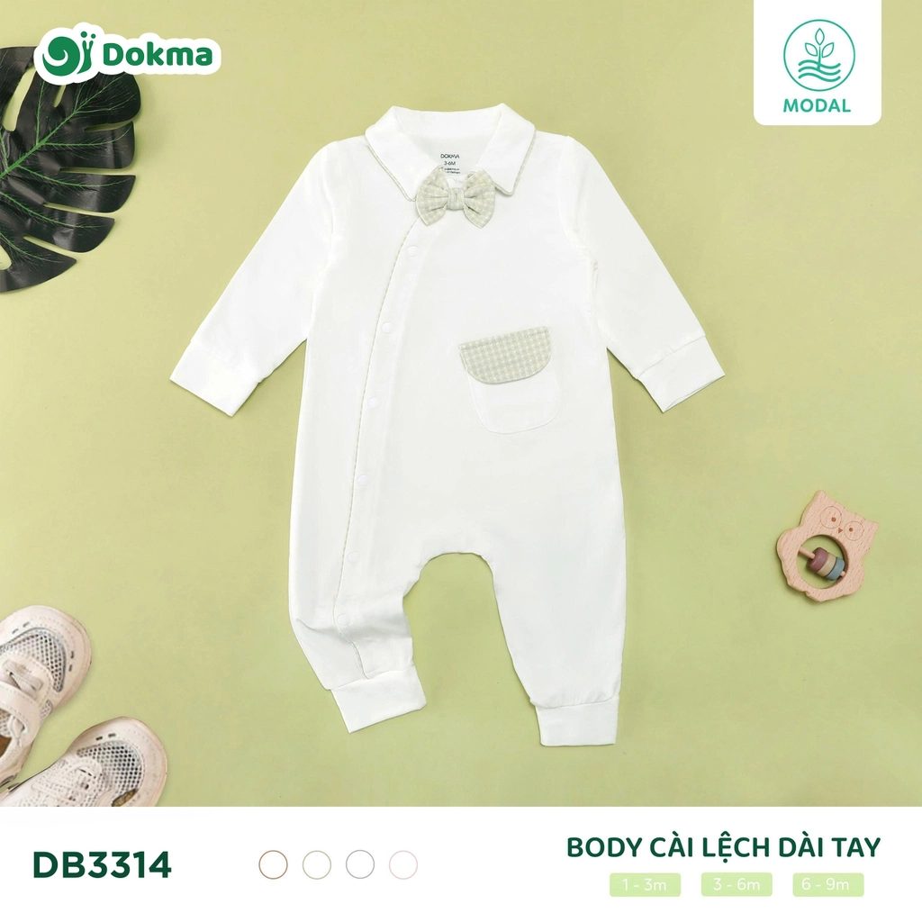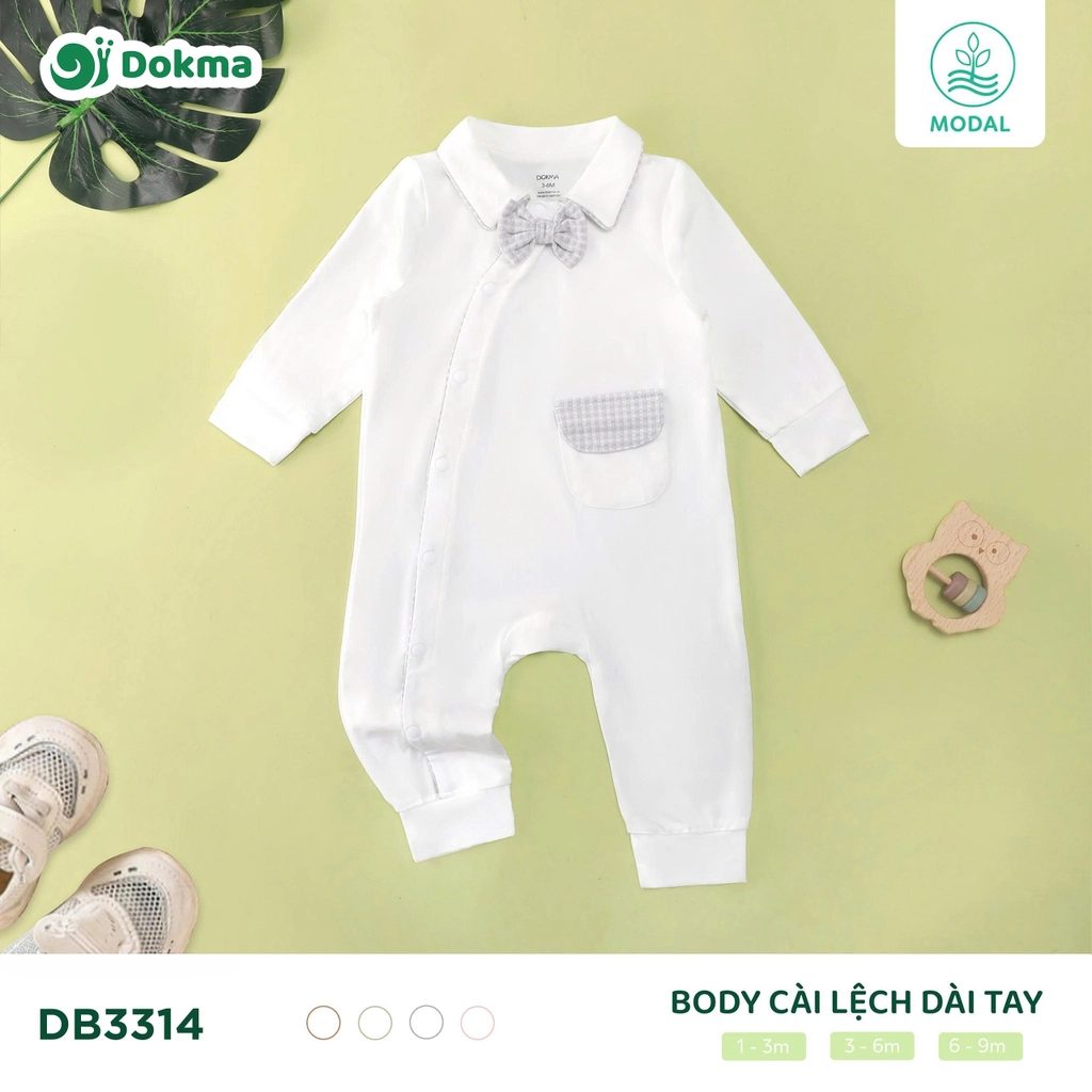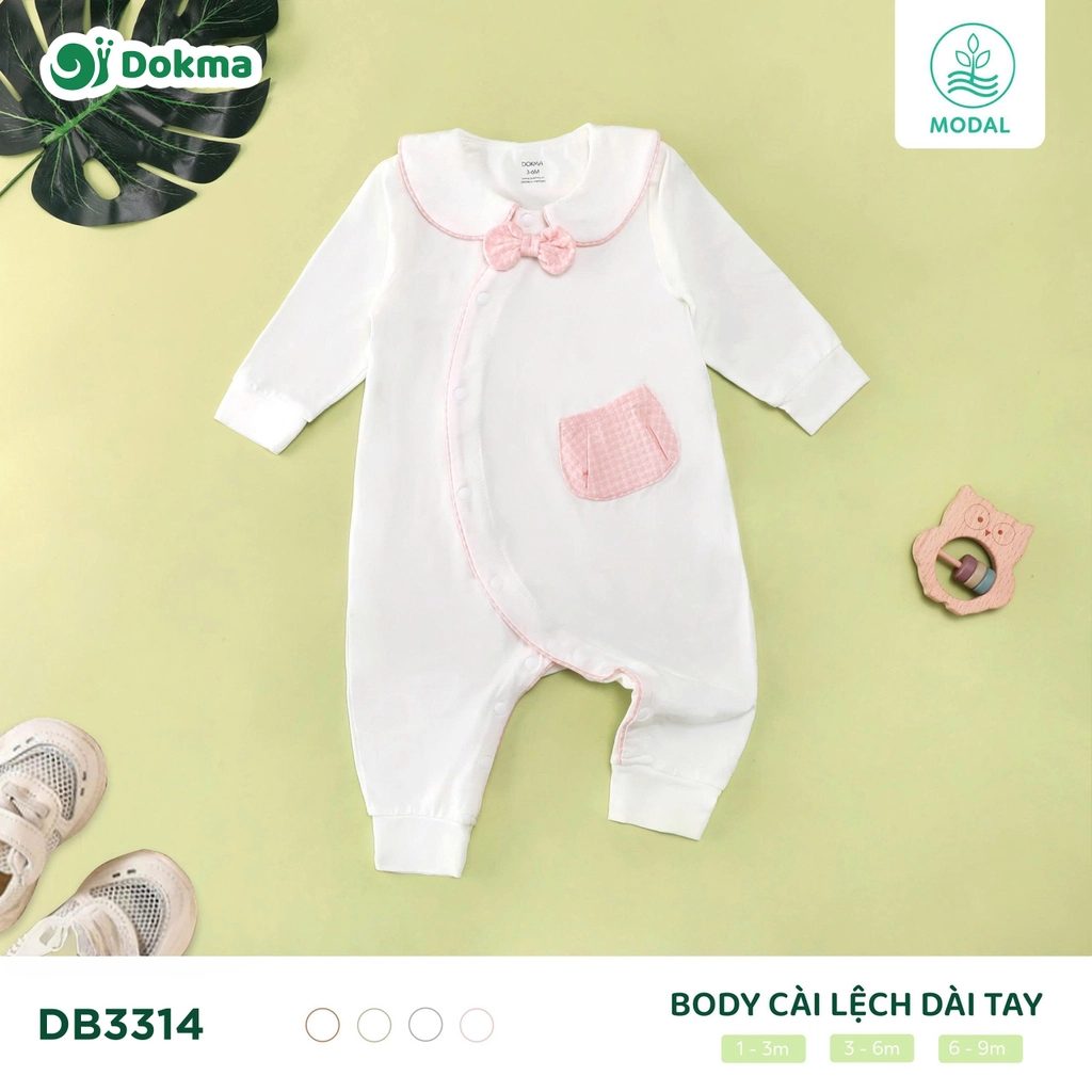 Dokma Long-Sleeve Wrap Bodysuit (Code: DB3314) features an elegant wrap-front design with a classic Peter Pan collar and delicate bow accent, offering a refined yet gentle look for newborns and young infants. Made from premium modal fabric, this bodysuit is exceptionally soft, breathable, and safe for sensitive skin, ensuring all-day comfort and ease of movement. The practical wrap closure allows for easy dressing without discomfort, while the clean stitching and subtle stretch provide durability and a comfortable fit. Available in bow pink, bow brown, bow grey, and bow blue, in sizes 1–9 months, this Vietnam-made product is well suited for international buyers sourcing high-quality, skin-friendly baby apparel with timeless design appeal.