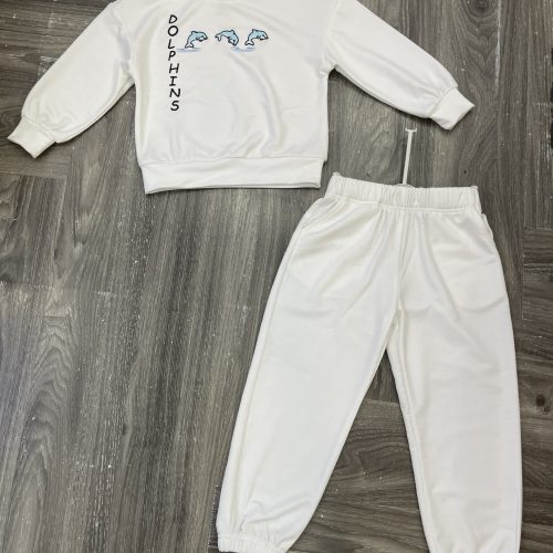The KIVIA-3027 Dolphins Sweat Suit Set is a premium 2-piece baby and toddler clothing set made from a soft cotton blend fleece that is warm, breathable and sweat-absorbent, featuring a long-sleeve sweatshirt with cute embroidered dolphin graphics and vertical “DOLPHINS” text, ribbed cuffs and hem, paired with elastic-waist jogger pants for all-day comfort and flexibility; designed for Autumn–Winter collections, this unisex set is suitable for daily wear, available in sizes 12M–36M with Middle East fitting, MOQ 600 pcs per design with 3–4 colors available, and offered under OEM/ODM production for international buyers and wholesalers.