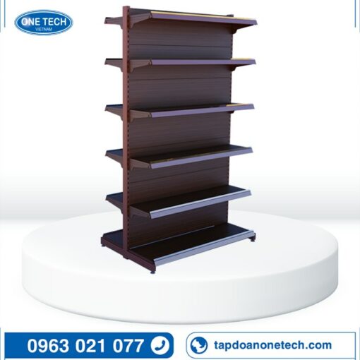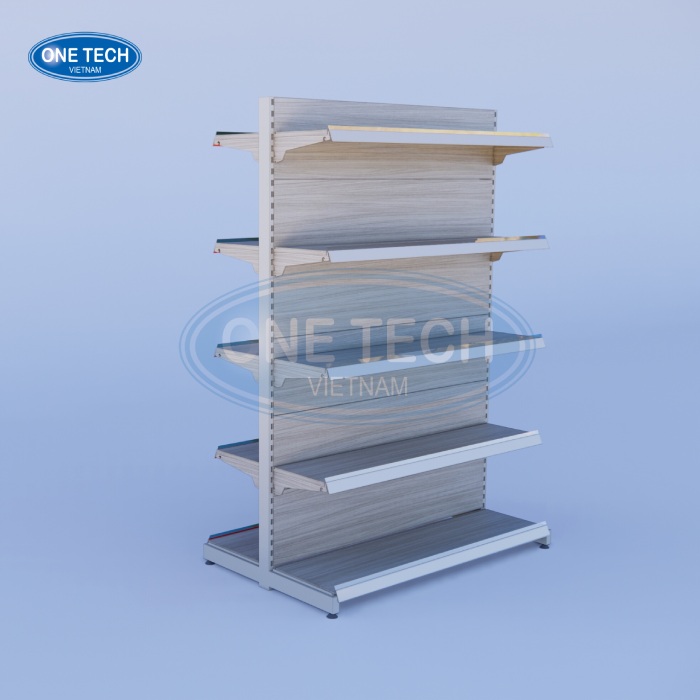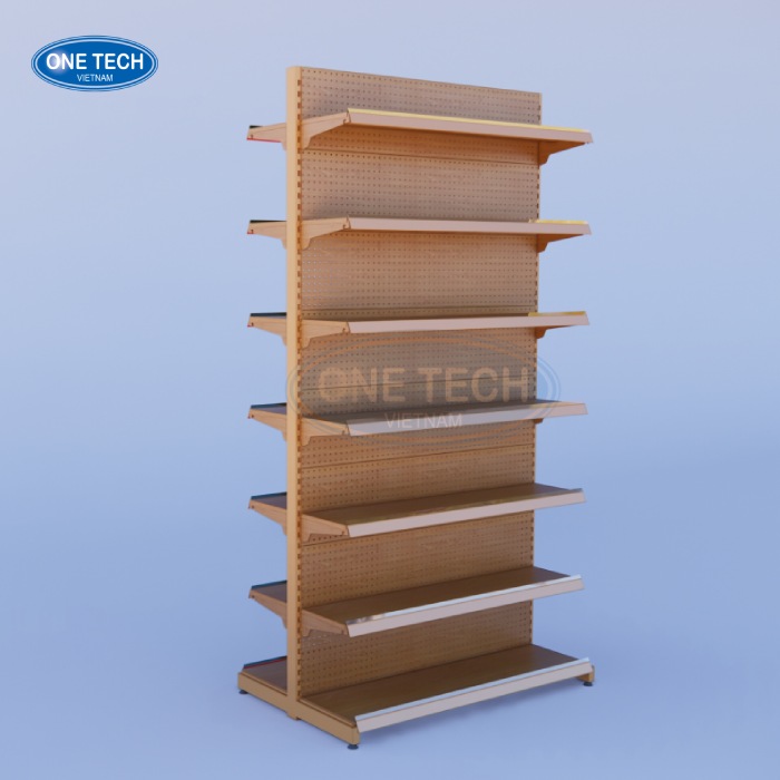 Designed and produced by One Tech in Vietnam, this double-sided wood-grain supermarket shelving system is built for retail chains, minimarts, and showroom rollouts that need a durable, high-load gondola solution with a premium wood-look finish; it offers configurable bay lengths/heights, selectable back panel styles (solid or perforated), and up to 80kg per shelf level to support everyday merchandising in high-traffic stores.