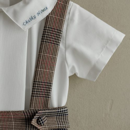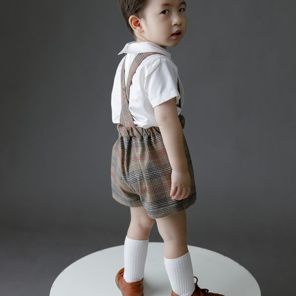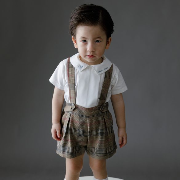 An ODM/OEM-capable formal kidswear set manufactured in Ho Chi Minh City, Vietnam, combining a short-sleeve khate shirt with a cotton overall in a vintage-inspired look with animal/plaid styling, designed to be breathable, skin-friendly, washable and airy for premium occasion programs; offered in sizes 6 months–3 years, MOQ 50 sets, and packed 1 set per zipper bag + 1 set per 18×40×22 cm box (or per buyer request) for export sourcing.