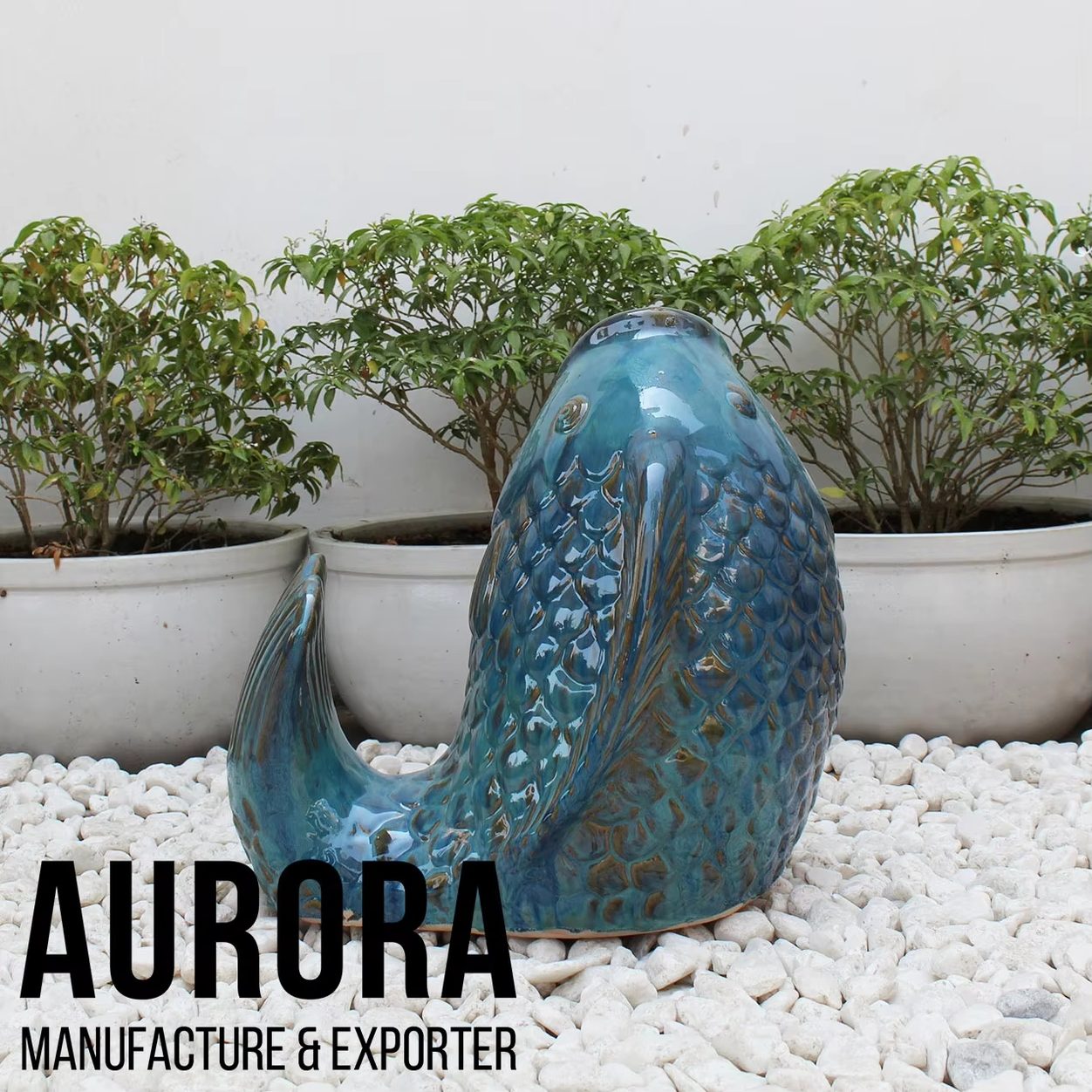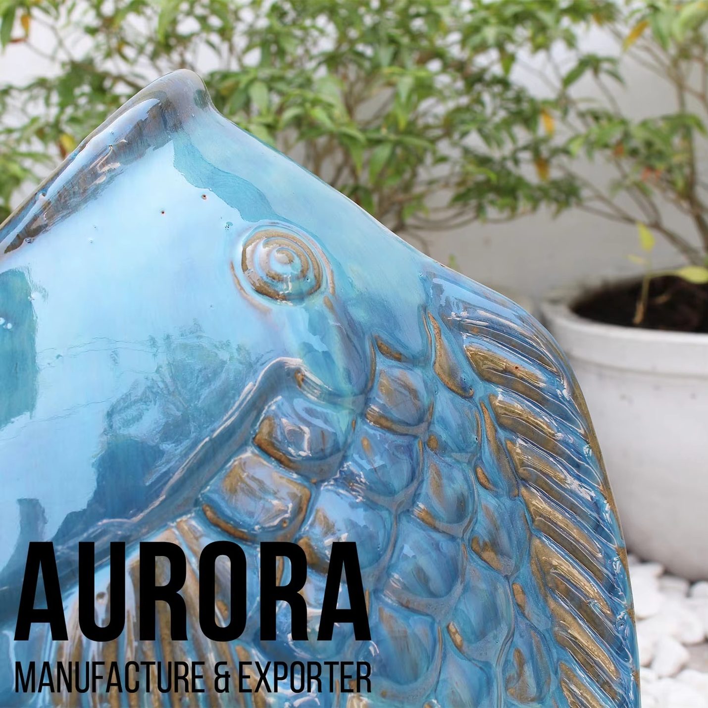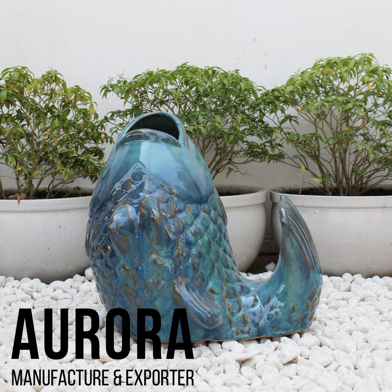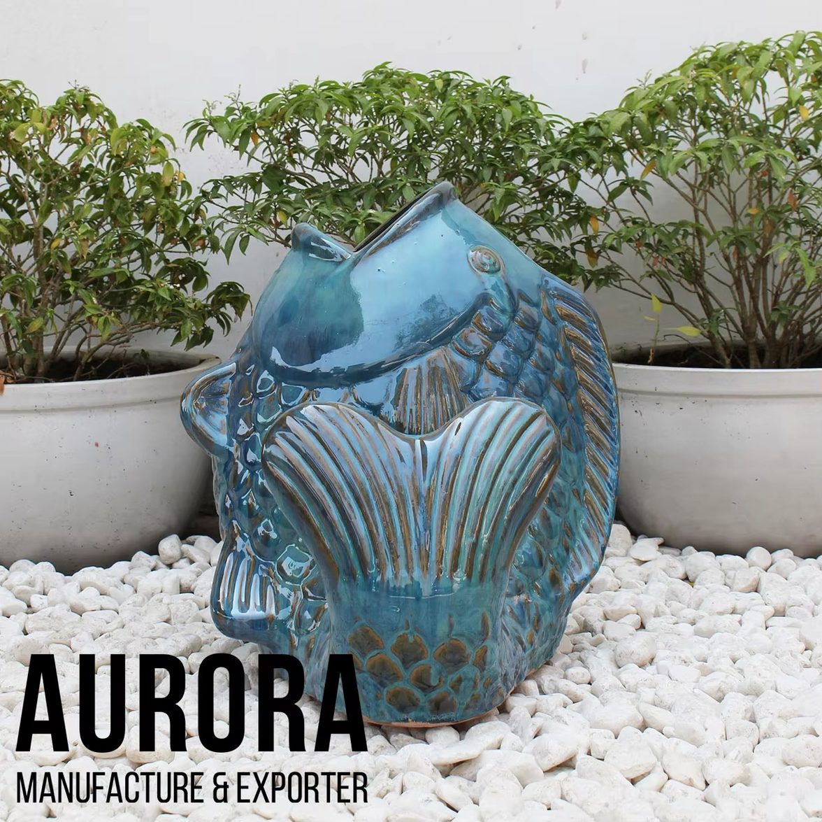 This glazed ceramic (clay) fish-shaped planter is a decorative statement piece for flower and green plant displays in home, garden, and nursery projects, matching classic/farmhouse styling with patterned detailing. Manufactured in Ho Chi Minh City, Vietnam, it is suitable for wholesale sourcing and export supply, with customization options for logo, packaging, and graphics to support private-label programs for international buyers.