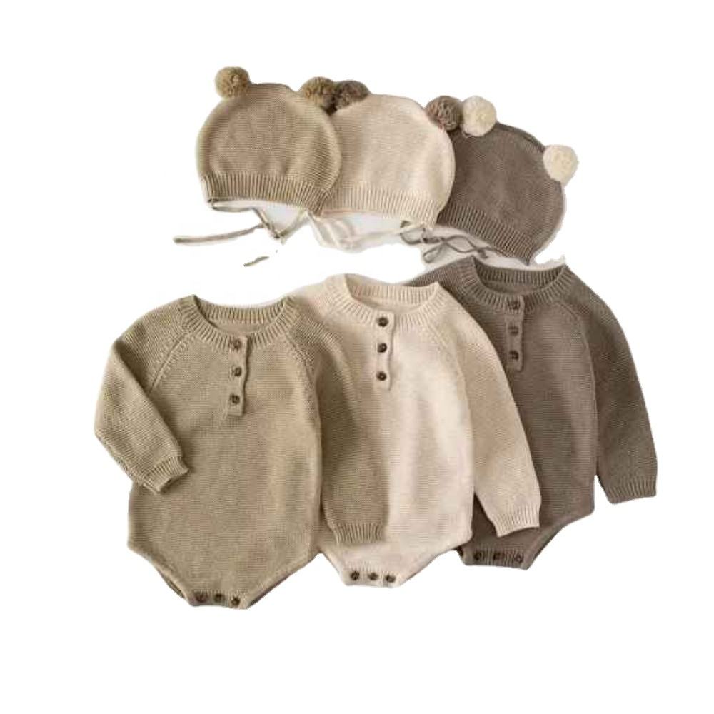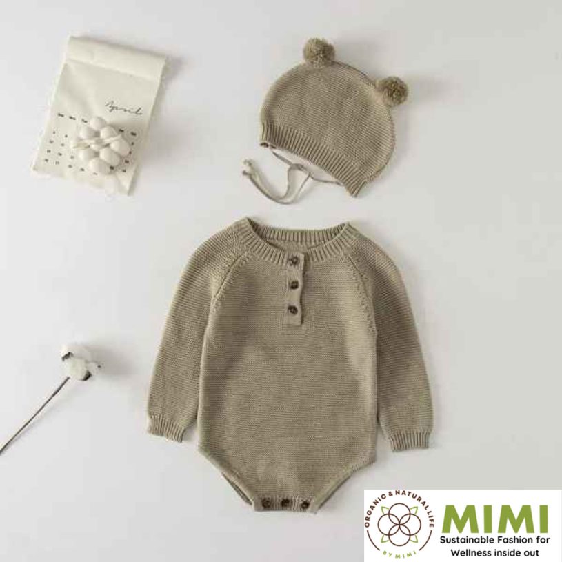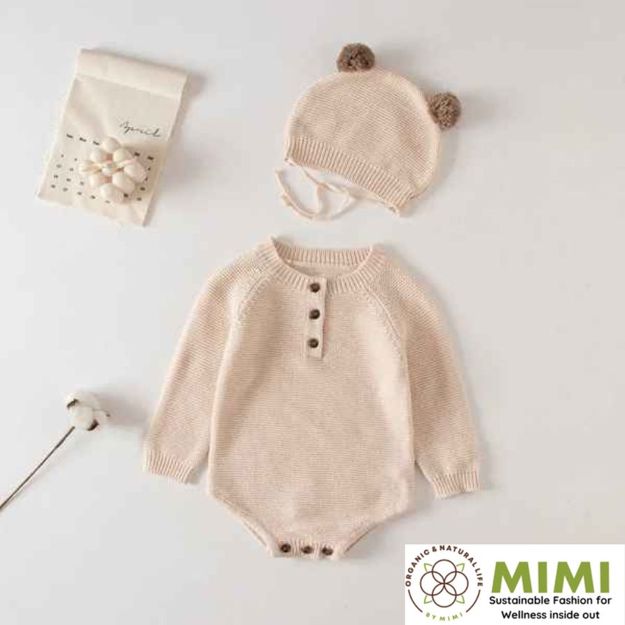 Made in Hanoi, Vietnam, this cute unisex baby set features a soft knitted romper with full sleeves and snap-button closure for easy changing, paired with a matching hat in a classic knit style—available with OEM/ODM service for international brands, importers, and distributors sourcing Vietnam-made organic baby apparel.