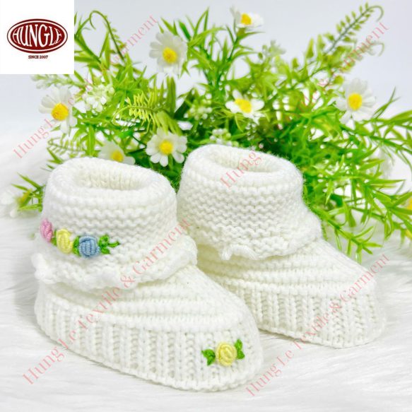 Cozy baby booties featuring delicate floral embroidery and a snug ribbed cuff, made in Ho Chi Minh City, Vietnam for breathable, washable, anti-wrinkle daily wear; suitable for international sourcing/export with OEM/ODM accepted, custom sizing, customer logo support, and flower color customization (MOQ can be bundled with apparel orders), with sample time 7–10 working days and delivery typically 7–15 days depending on order volume.