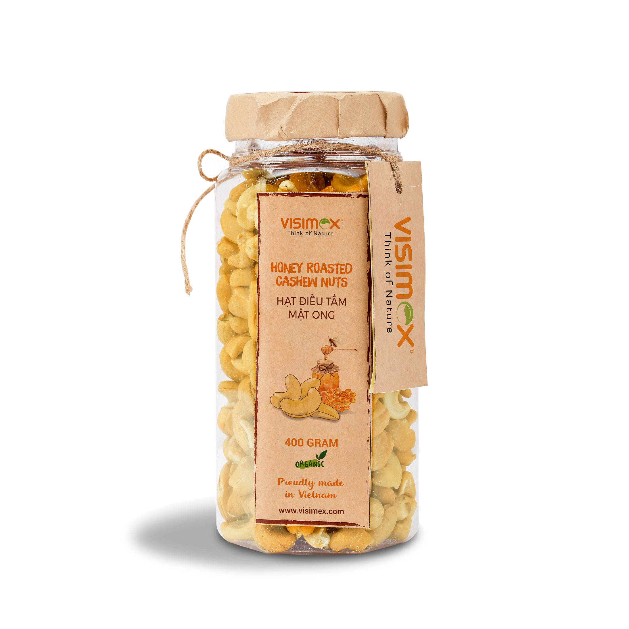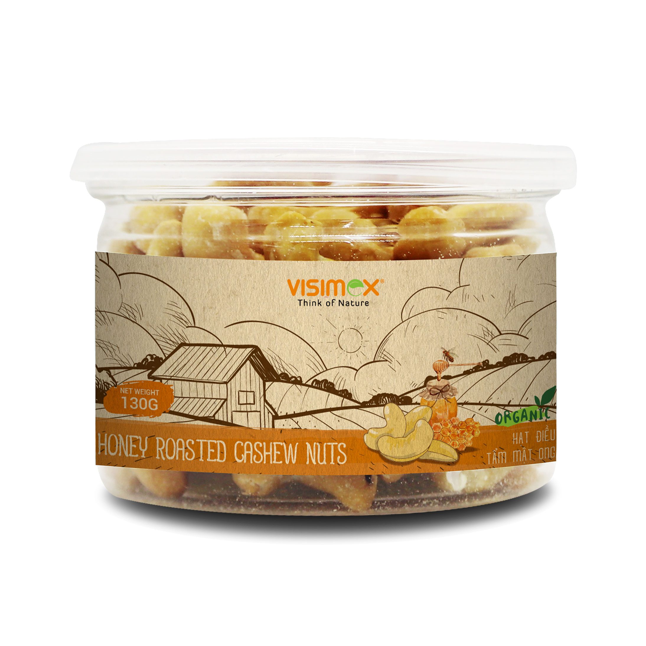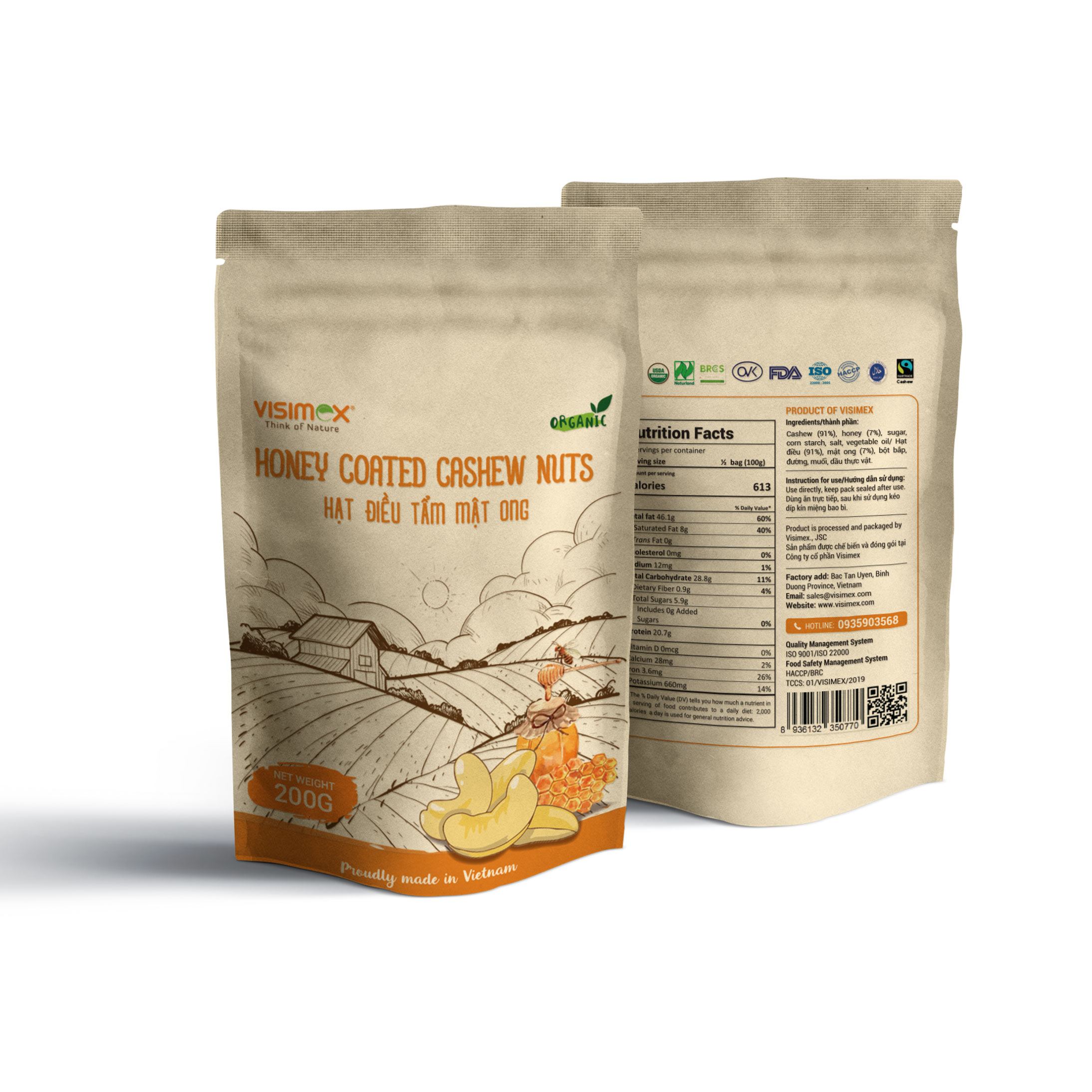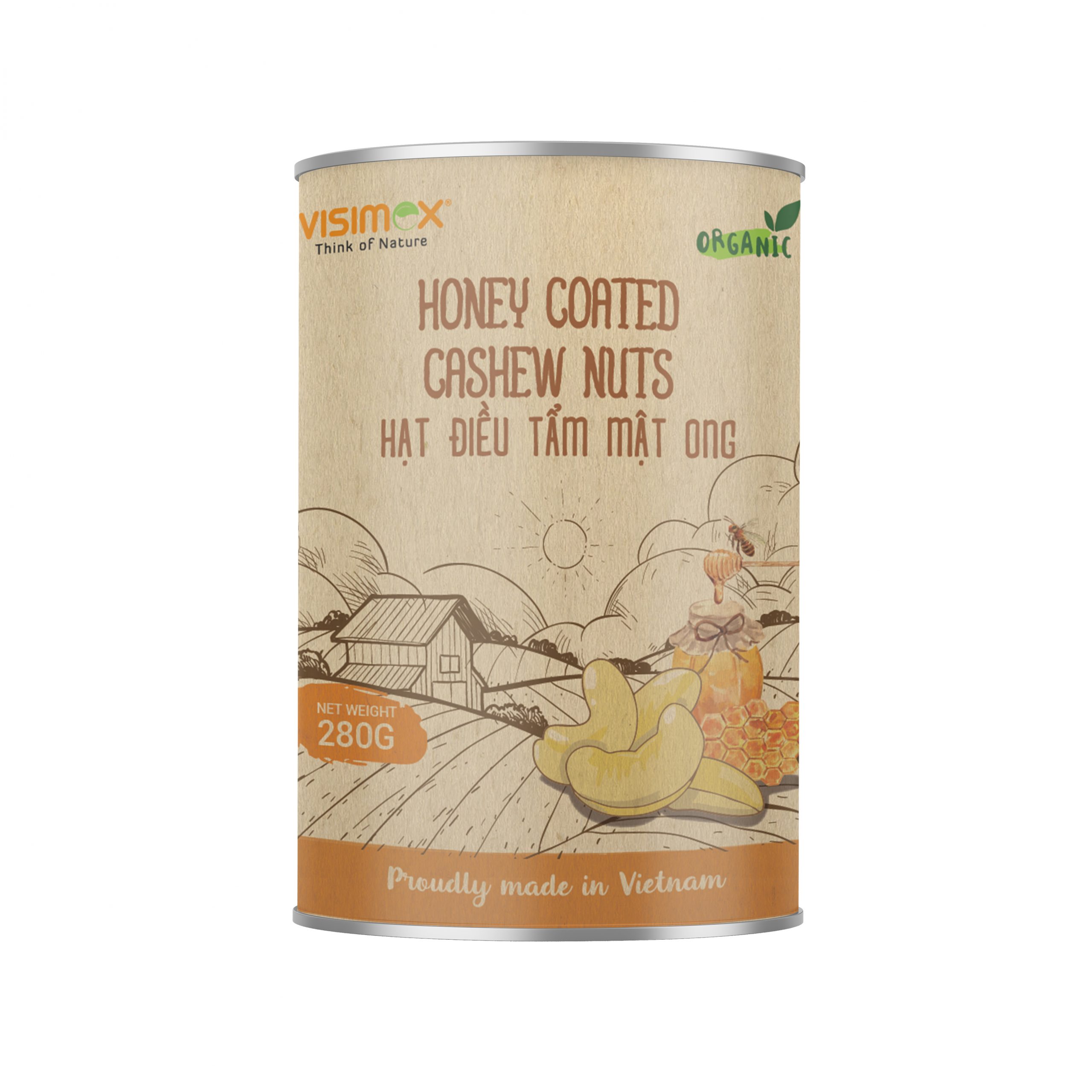 Honey-Roasted Cashew Nuts are produced in Vietnam using organic cashew nuts (95.94%) lightly coated with sugar and honey (1.66%) to deliver a balanced sweet-roasted flavor and crisp bite for snack and gifting lines. Suitable for importers and snack brands sourcing value-added cashew products for wholesale distribution or private label repacking, available in flexible pack sizes from 30g to 500g.