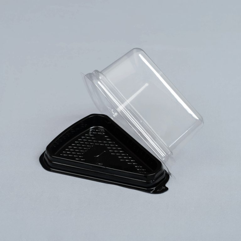JB-03 is a premium triangular slice container for single-serve desserts, combining a crystal-clear PET dome lid with a rigid black PET base to showcase decorations while protecting delicate toppings with generous headroom; the tight snap-fit seal helps keep contents fresh and secure, the fine anti-slip textured base reduces sliding during transport, and reinforced ribs support stable stacking in bakery displays and delivery cartons, with a small lift tab for quick, hygienic opening and clean flat areas for branding, date, or barcode labels—ideal for cake slices, cheesecakes, tiramisu, mousse, and takeaway dessert programs; lid 14.0 × 11.15 × 6.8 cm, base 14.0 × 11.15 × 1.5 cm; packing 500 sets/pack (lid + base); made in Vietnam and suitable for export sourcing.