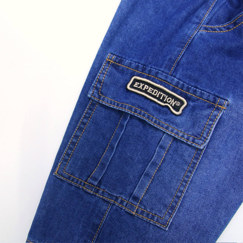 Wholesale kids’ jeans made from 100% cotton with a practical cargo-pocket design for comfortable everyday wear; manufactured in Hanoi, Vietnam for export sourcing, offered as in-stock items and supported with OEM/ODM services, with customization available for logo, packaging, and graphics and 7-day sample support for international buyers.