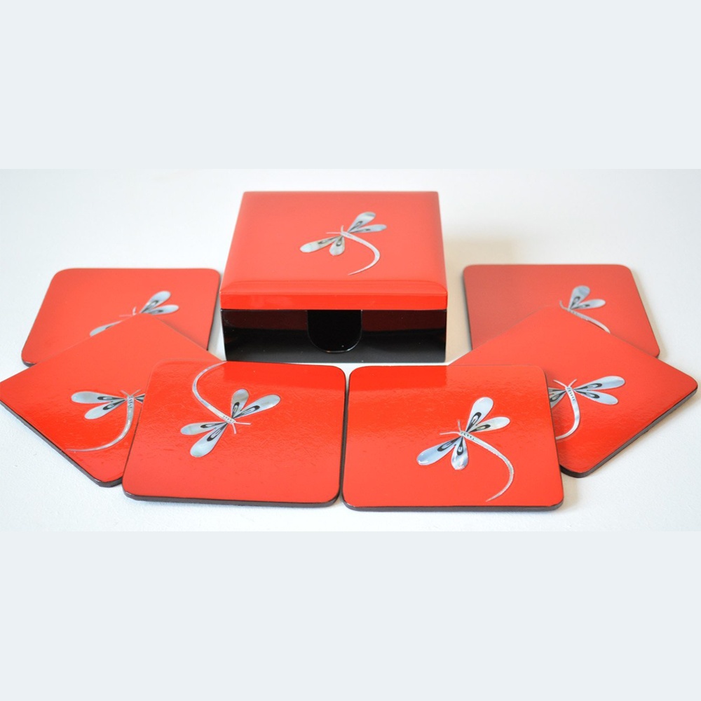 A Vietnam-manufactured lacquer coaster set for international sourcing, with a glossy red lacquer finish and mother-of-pearl inlay accents. Built on CARB P2 MDF board for export-oriented quality and available for OEM/ODM customization.