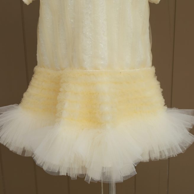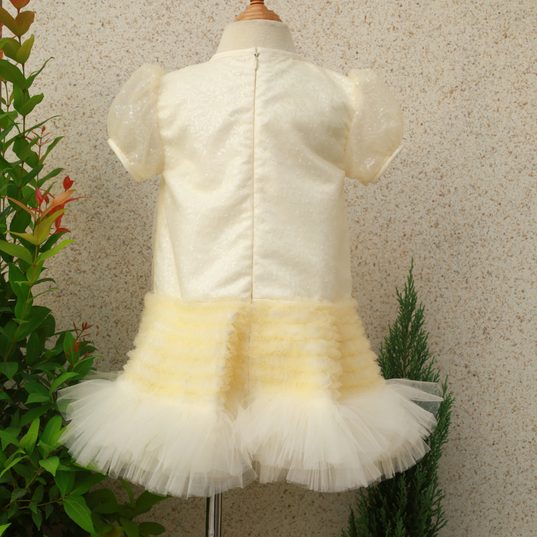 An ODM/OEM-capable premium children’s occasion dress manufactured in Ho Chi Minh City, Vietnam, designed with an O-Neck and short sleeves in a billowy multi-layer ball-gown silhouette, featuring layered tulle and sequin tulle over taffeta with satin lining, finished with hand-beaded detailing for boutique “twinkle” collections; available in sizes 6M–9Y (or customized), standard color yellow or custom colors, MOQ 50 pcs, and export-ready packing of 1 pc per zipper bag + 1 pc per 18×40×22 cm box (or per buyer request).
