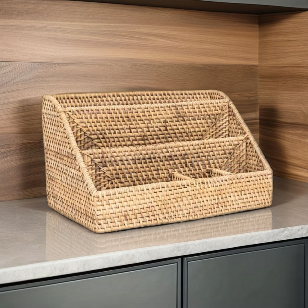 Luxury Multifunction Rattan Kitchen Storage Shelf (Organizer Rack, Model DKT04) is a Vietnam-made kitchen organizer designed to store and display everyday kitchen gadgets in a clean, luxury-style presentation. Built for multifunction use in kitchen spaces, it supports homeware importers and retailers seeking practical storage racks that enhance countertop organization and visual merchandising. Supplied as single-item units, this shelf fits wholesale programs and curated kitchen organization collections.