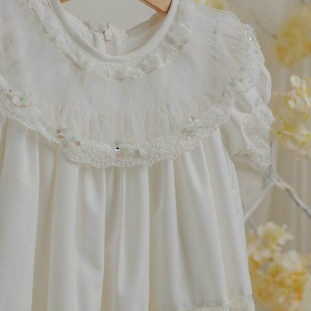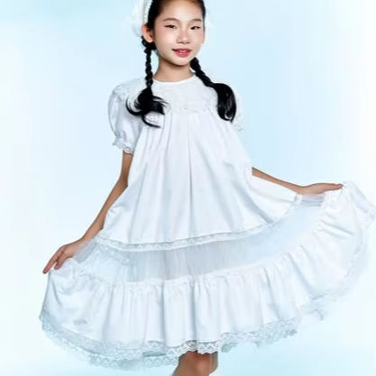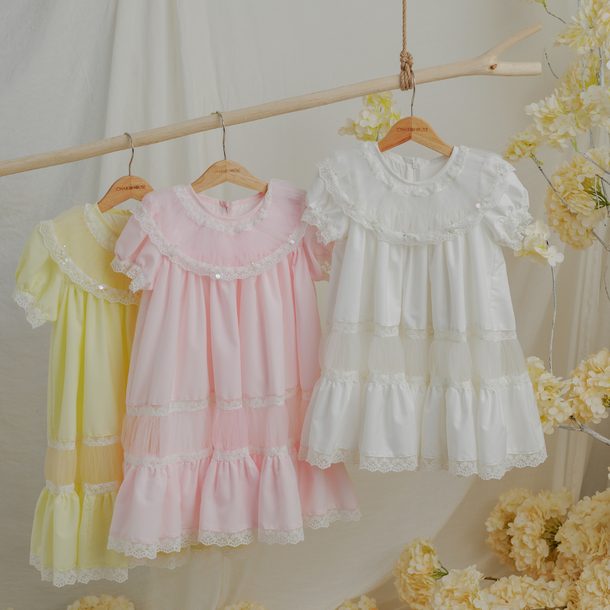 An ODM/OEM-capable premium kids’ occasion dress manufactured in Ho Chi Minh City, Vietnam (Model DMBC02), designed in a straight silhouette with O-Neck and short sleeves, featuring a multi-layer build with tulle and khate outer layer plus cotton lining, finished with hand beading, lace connection and ruffle detailing for boutique birthday and party programs; available in sizes 6M–9Y (or customized), colors in Pink/Yellow/White/Blue or customized, MOQ 50 pcs, and export-ready packing of 1 pc per zipper bag + 1 pc per 18×40×22 cm box (or per buyer request) for international sourcing.