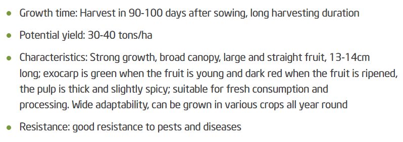 No.20 Spicy Chili Seed is a high-yield chili variety developed and widely cultivated in Vietnam, suitable for both fresh consumption and processing. The crop reaches first harvest in 90–100 days after sowing and offers a long harvesting period, with yield potential of 30–40 tons/ha. The variety features strong plant growth, broad canopy, and uniform, straight fruits measuring 13–14 cm in length. Fruits turn from green at the young stage to dark red at full maturity, with thick flesh and mild spiciness. No.20 Spicy Chili shows good resistance to major pests and diseases, wide adaptability, and can be grown year-round, making it suitable for commercial farming and export-oriented sourcing.