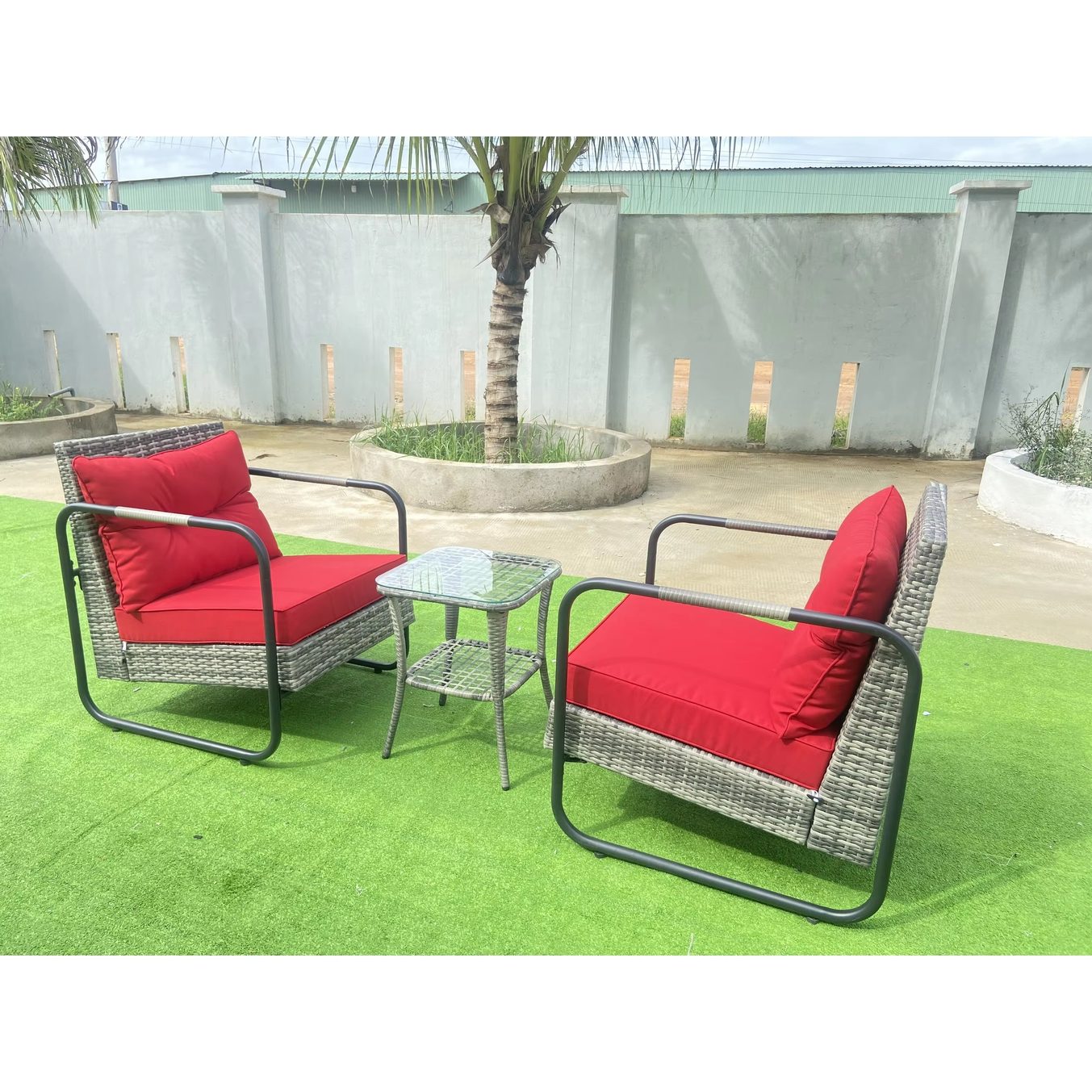 Relax in contemporary outdoor comfort with this 3-piece glider bistro set, designed for international buyers sourcing durable patio furniture made in Vietnam. The set includes two smooth-gliding chairs and a matching glass-top side table, combining handwoven PE rattan with a powder-coated steel frame for rust-resistant performance. Plush cushions with washable covers and an easy-clean tempered glass tabletop make it ideal for patios, porches, balconies, gardens, and hospitality outdoor spaces.