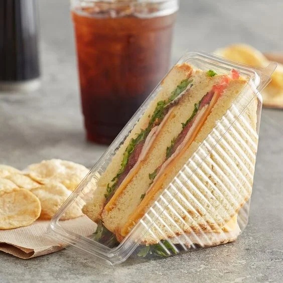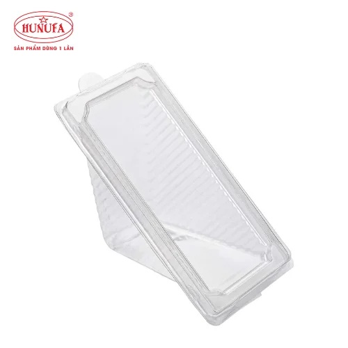 Virgin PET sandwich/cake containers manufactured in Vietnam, featuring a clear white finish and a premium triangular shape to enhance product visibility and shelf appeal while keeping pastries protected during transport and display; the rigid one-piece design helps prevent crushing, the tight-fitting lid improves hygiene and reduces leakage risk, and the embossed inner pattern helps stabilize the cake inside—ideal for sandwiches, mooncakes, sponge cakes, and similar bakery items, supplied in bulk packing 1×1000 with custom sizes available for international bakery and F&B packaging buyers.