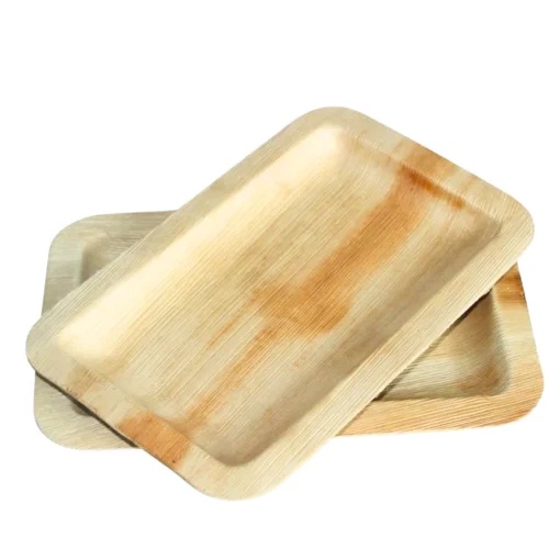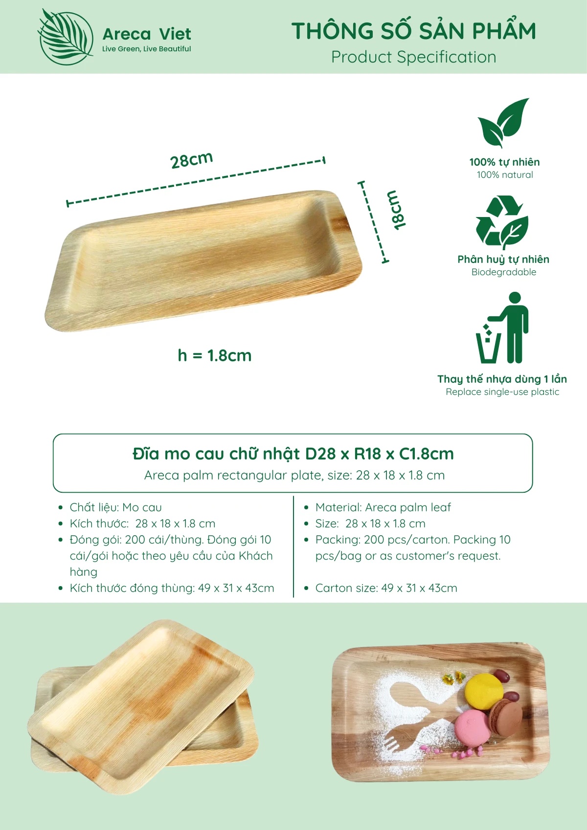 Made in Vietnam from natural areca palm sheath (mo cau), this rectangular plate offers a space-efficient serving format with a smooth surface and distinctive natural grain for a rustic premium look. The 28 × 18 × 1.8 cm size is well-suited for main dishes, snacks, desserts, and plated portions in catering, outdoor dining, and event service, providing a plastic-free, chemical-free alternative that supports sustainable foodservice sourcing and export programs.