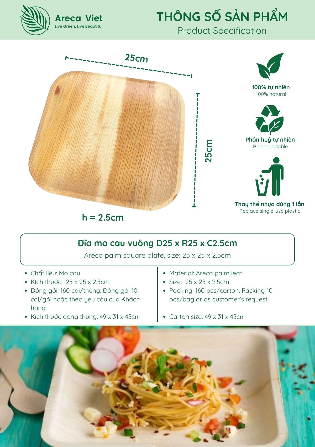 Made in Vietnam from natural areca palm sheath (mo cau), this square plate delivers a clean, modern serving format with a rustic natural grain finish for premium eco-friendly presentation. The 25 × 25 × 2 cm size is ideal for main dishes, shared plates, and buffet/event service, offering a plastic-free, chemical-free alternative that is lightweight yet sturdy for foodservice sourcing, catering, outdoor dining, and sustainable packaging programs.