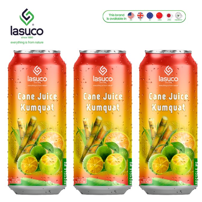 Made in Vietnam (Thanh Hoa) by Lasuco Group, this ready-to-drink beverage blends 98% fresh-squeezed sugarcane juice with 2% kumquat juice for a naturally sweet taste and light citrus finish; sterilized for consistent quality with a 12-month shelf life, low-fat (0%), packed in 320ml tinned cans (24 cans/carton), and supplied under LavinaFresh or OEM/private label for international importers and distributors.