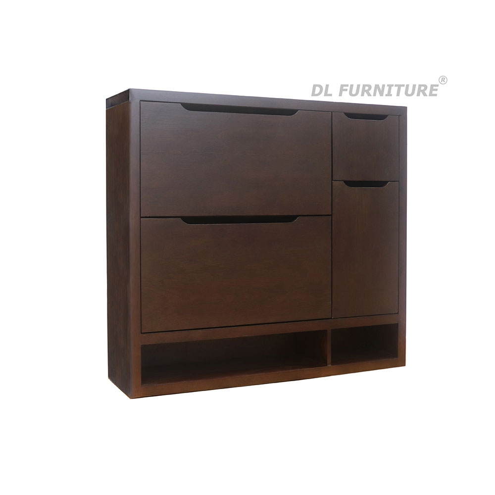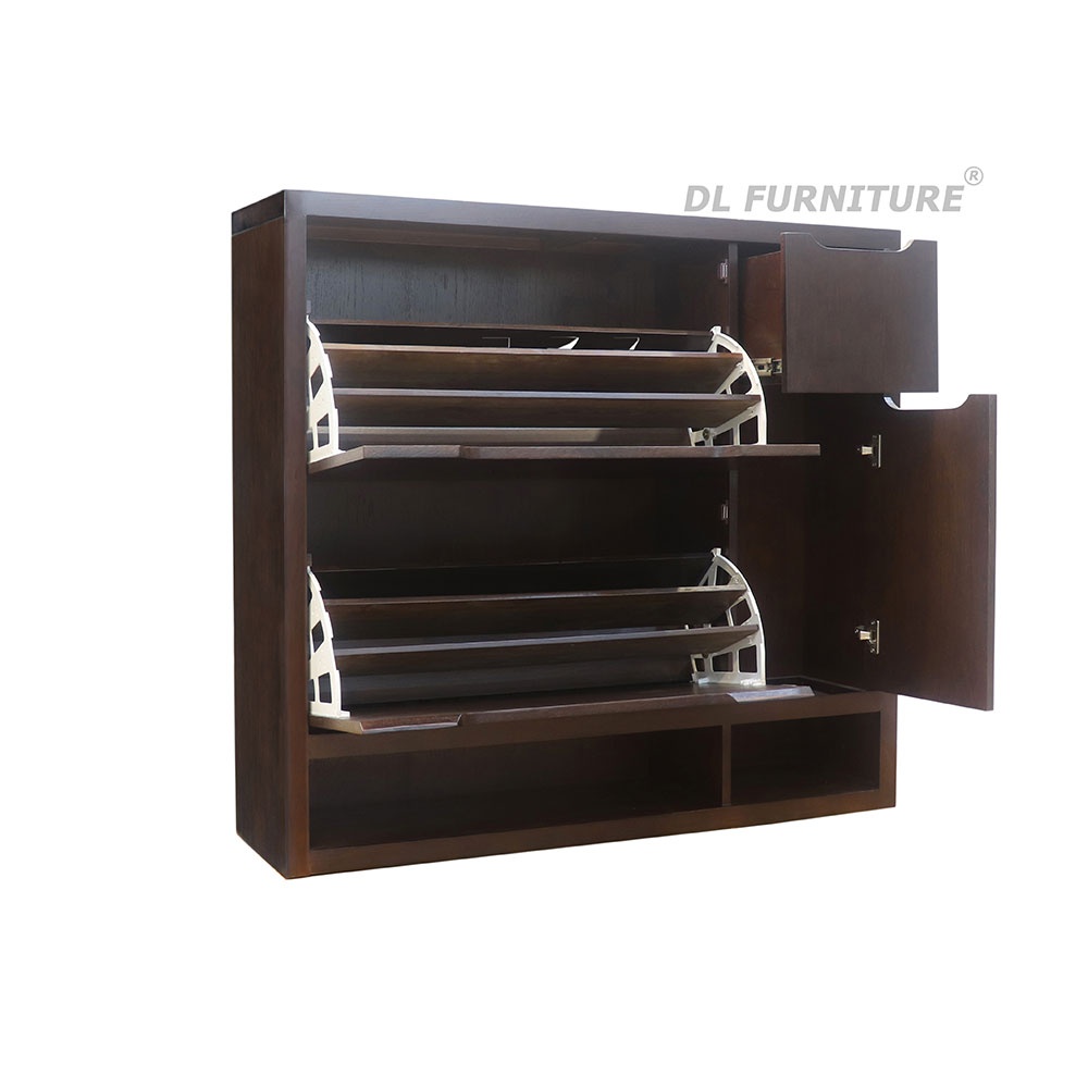 A practical shoe cabinet for residential and project use, specified as MDF with oak-grain veneer, made in Vietnam and suited for importers sourcing functional, space-efficient storage furniture.