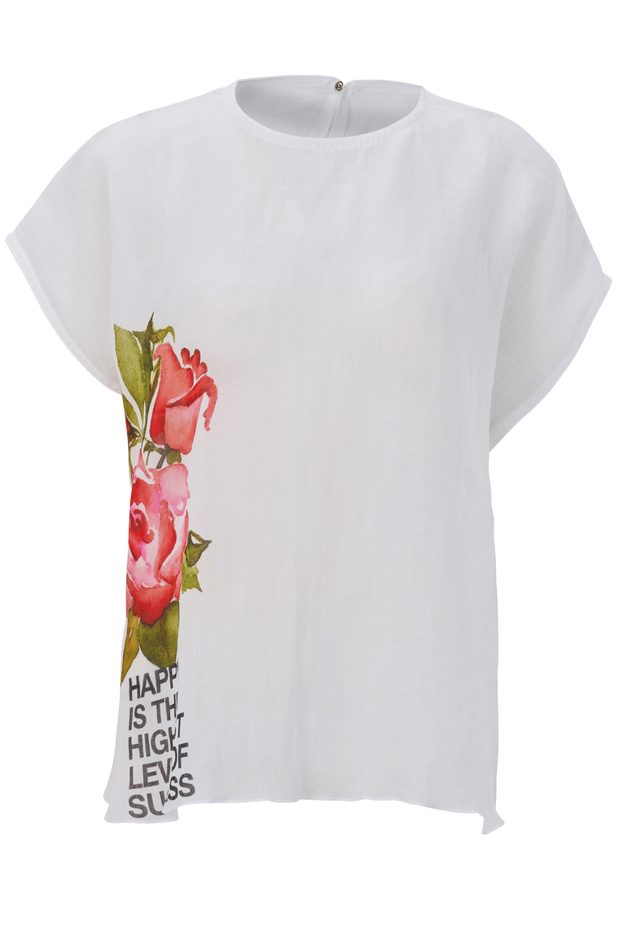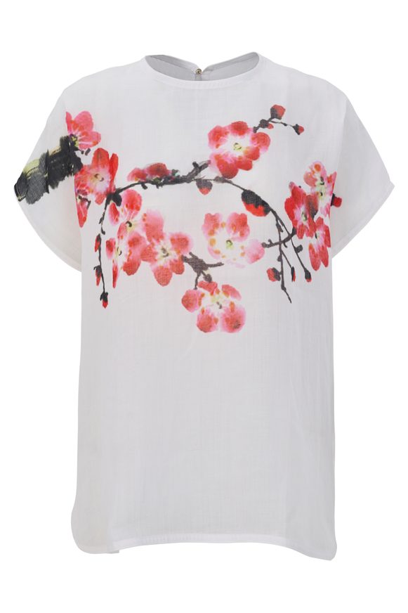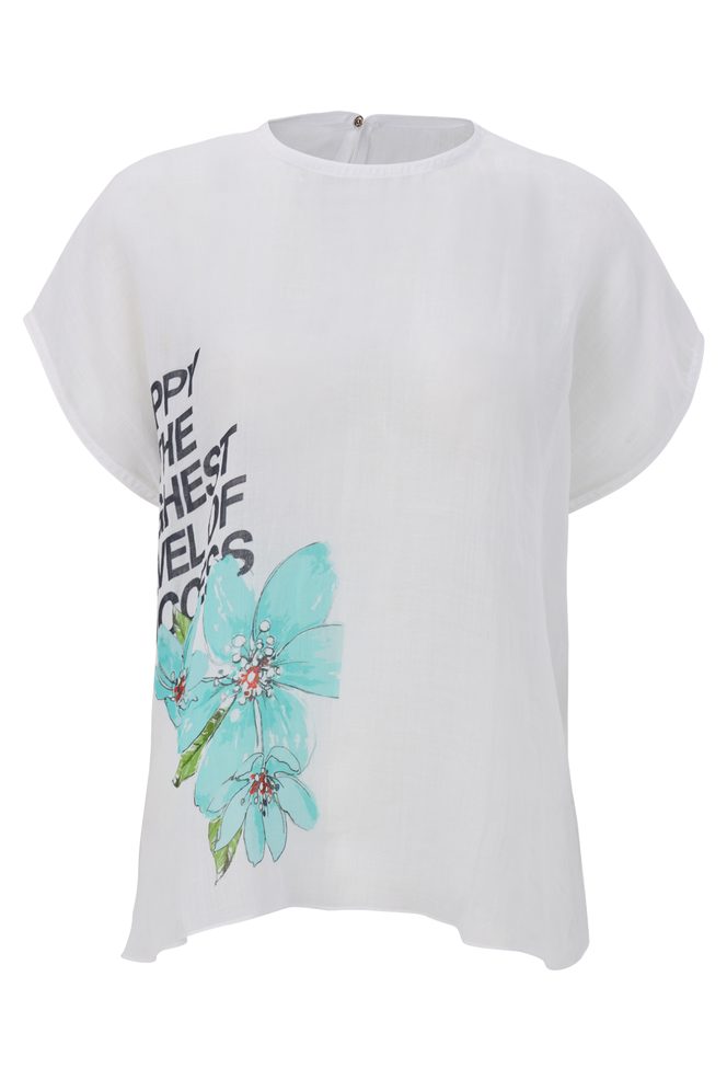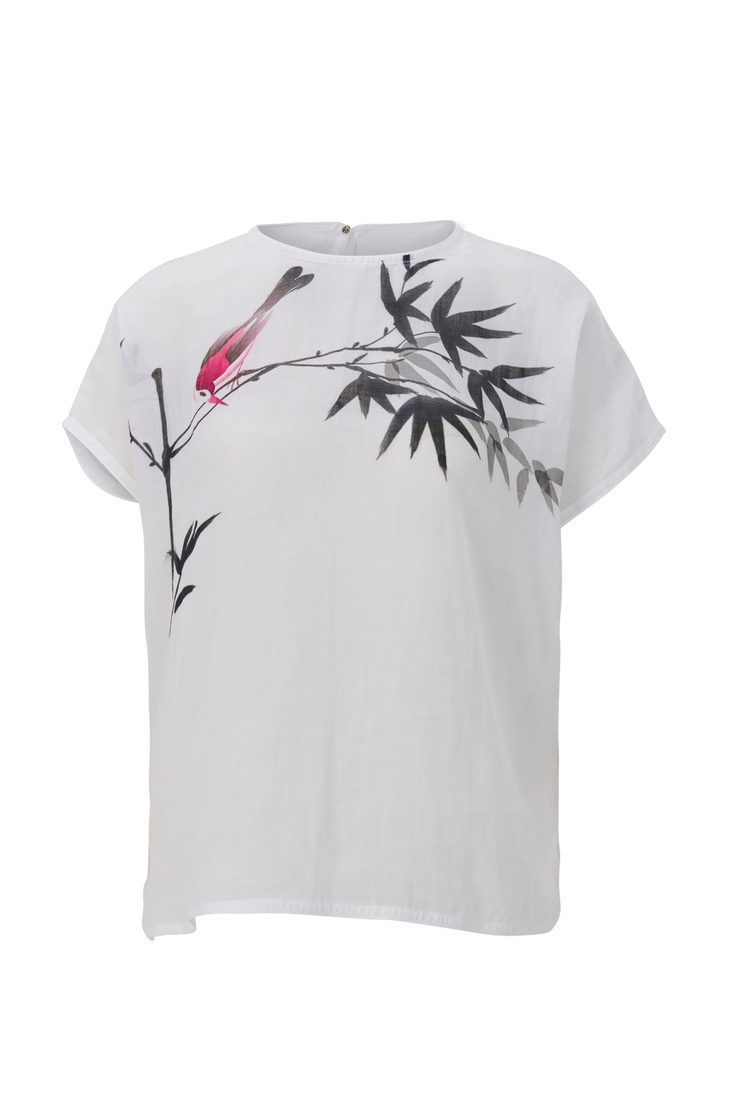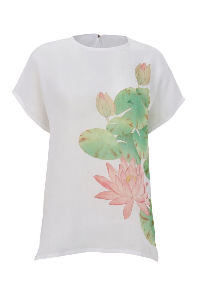 This thin short ramie shirt features an exclusive design by renowned designer Minh Hanh, crafted using digital printing technology with a round neckline, batwing sleeves, and side-slit hem for ease of movement; made from premium Vietnamese ramie fabric, the shirt offers excellent breathability, moisture absorption, and natural antibacterial properties, and is fully sourced and produced in Vietnam through a high-quality process from fiber production to weaving and dyeing, making it a refined choice for premium sustainable fashion collections.