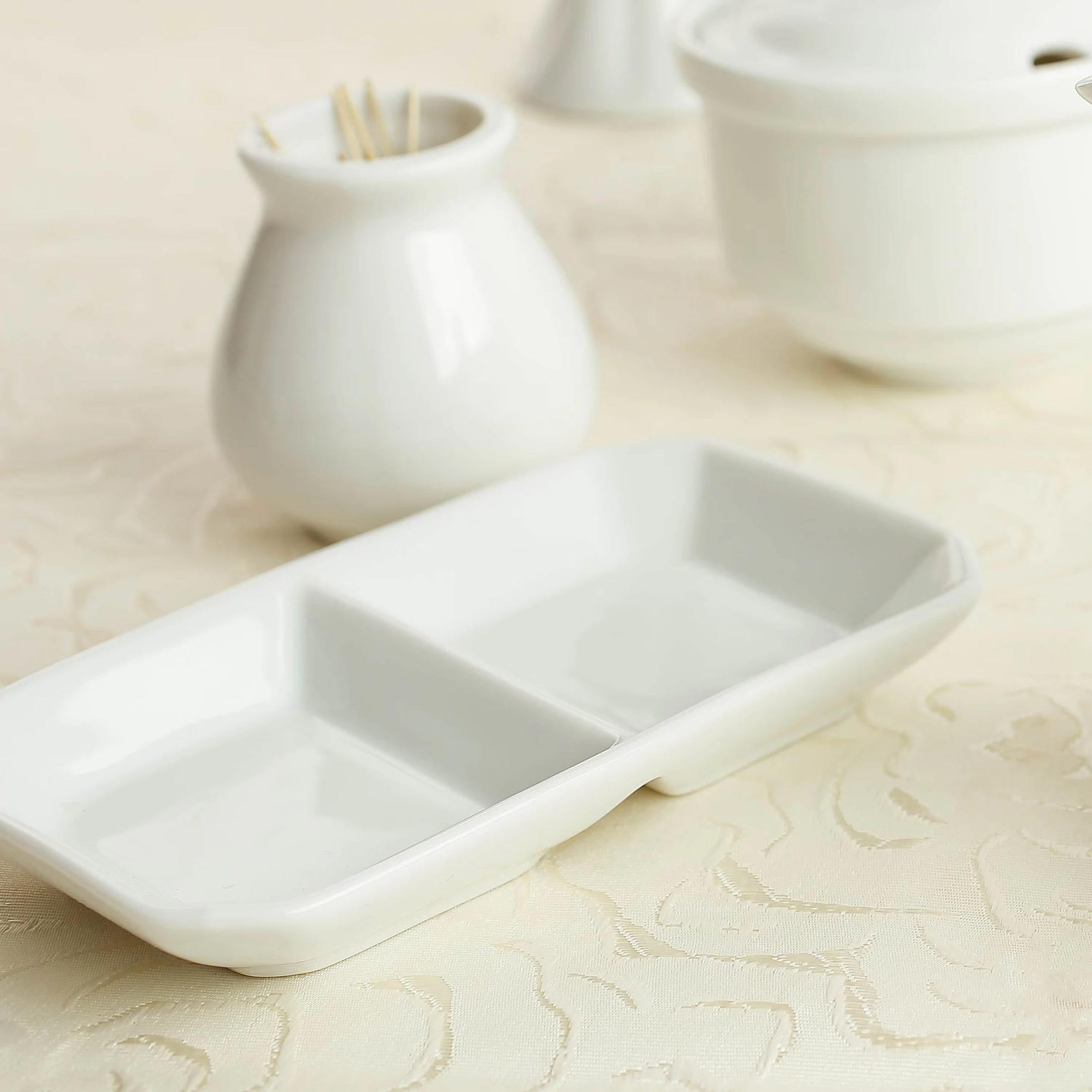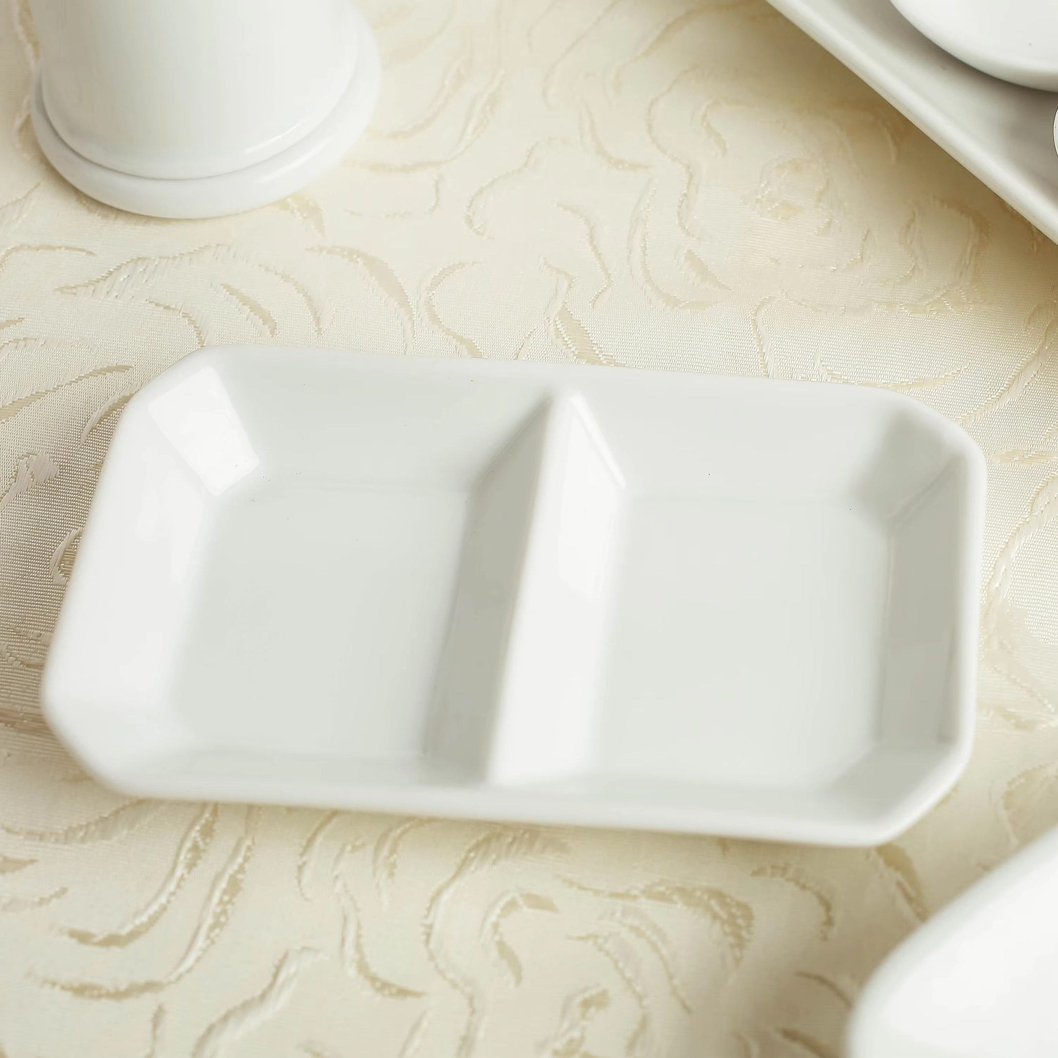 A compact two-compartment porcelain condiment dish designed for HoReCa service, ideal for separating salt & pepper, dipping sauces, spices, or small sides on a single plate. Manufactured in Bac Ninh, Vietnam, this classic white tableware piece supports consistent quality for bulk sourcing and fits restaurants, hotels, catering, and food service distributors that need clean, professional presentation. Custom pattern/logo options and export-suitable packaging are available to meet different branding and market requirements.