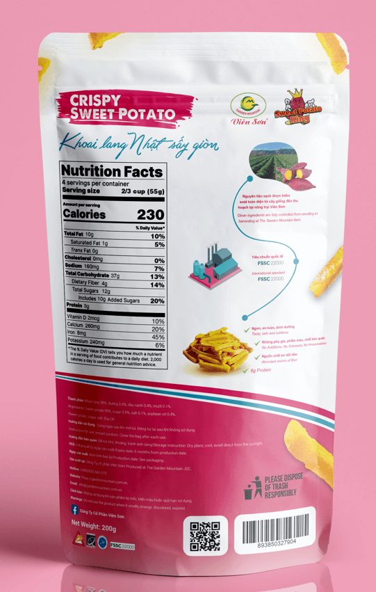 Vacuum-Fried Crispy Sweet Potato Sticks are made in Vietnam from Beniazuma sweet potatoes and processed with vacuum-frying to deliver a light, crunchy texture and natural sweet-potato taste, positioned for distributors and snack brands seeking a clean-label, export-ready item. Packed in resealable 120g or 200g pouches, the product is presented as free from additives, artificial colorants, and preservatives (as stated on pack) and produced under FSSC 22000 standards, suitable for modern retail, gifting, and foodservice snack programs.