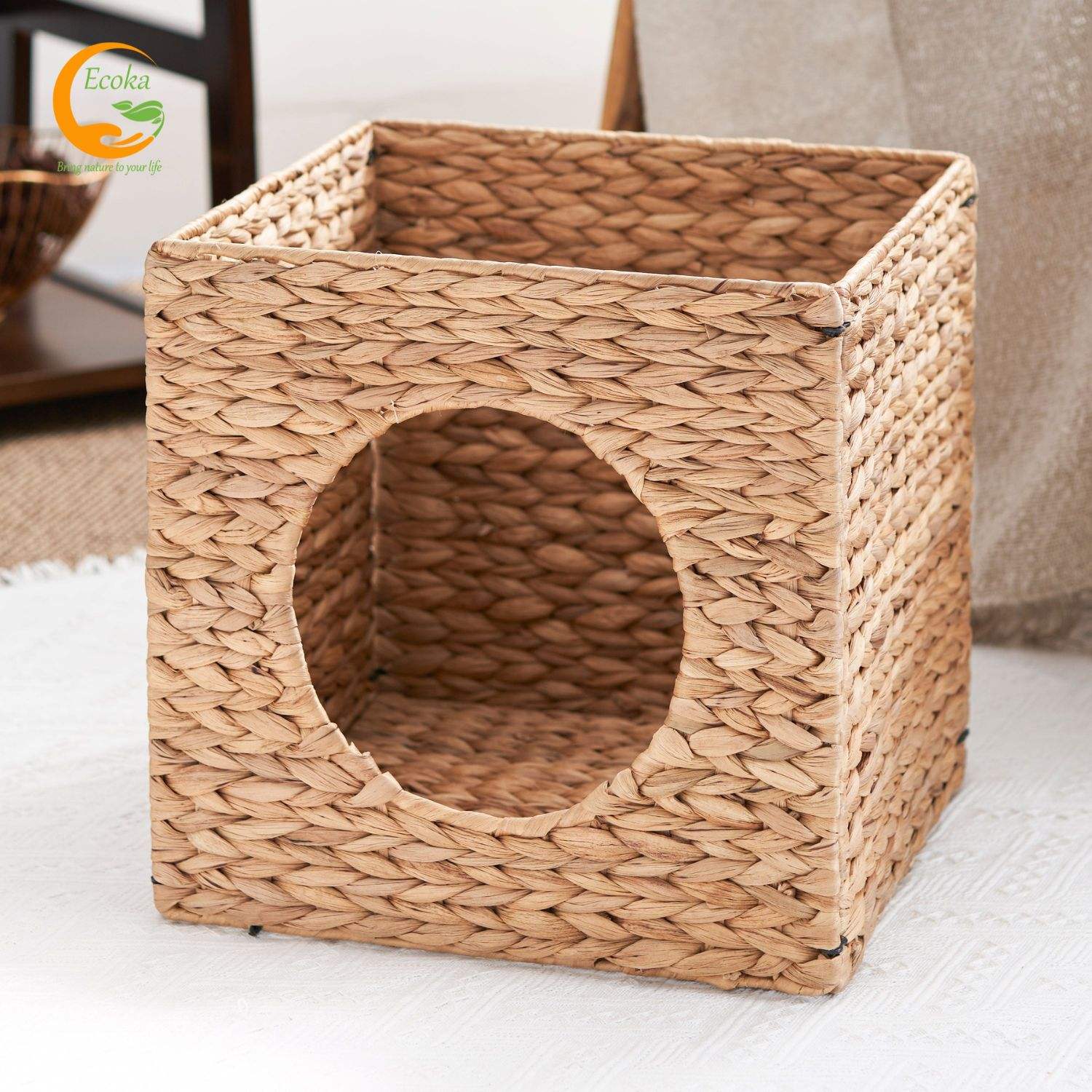 Handwoven in Vietnam from natural water hyacinth with an iron frame, this enclosed cat bed cave provides a secure, private resting space for small to medium pets while adding a classic, decorative look to indoor settings; it features a solid-tone woven finish (arrow weave style as provided), a removable and washable inner cushion filled with polyester/cotton/faux fur (hand wash), and is positioned as an eco-friendly, waterproof, stocked item suitable for wholesale sourcing and export supply.