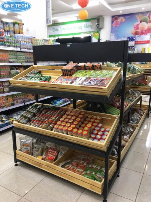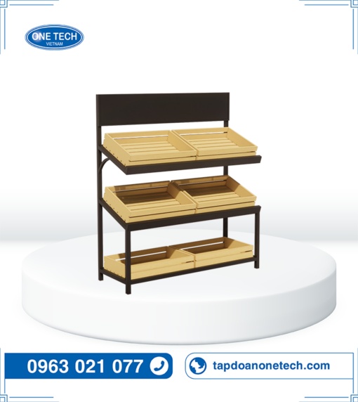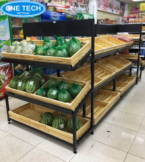 Manufactured in Vietnam for grocery and fresh-food retail, this 3-tier produce rack combines a powder-coated steel frame with wooden trays to present fruits and vegetables neatly at shopper-friendly height; the integrated top bar supports branding or product information signage, making it a practical fixture for retailers and distributors sourcing durable in-store displays.