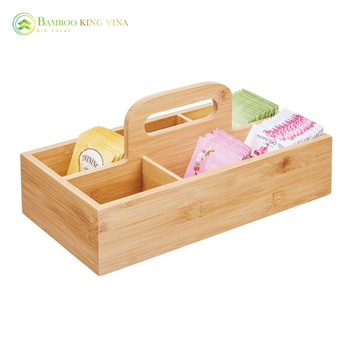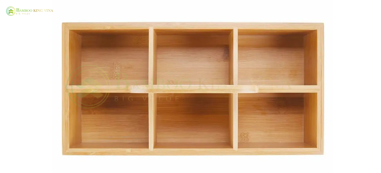 This 6-compartment bamboo organizer tray with handles is manufactured in Vietnam from treated Luồng bamboo for improved durability and easy cleaning, offering an export-ready organizing/serving solution for international B2B buyers with OEM packaging support.