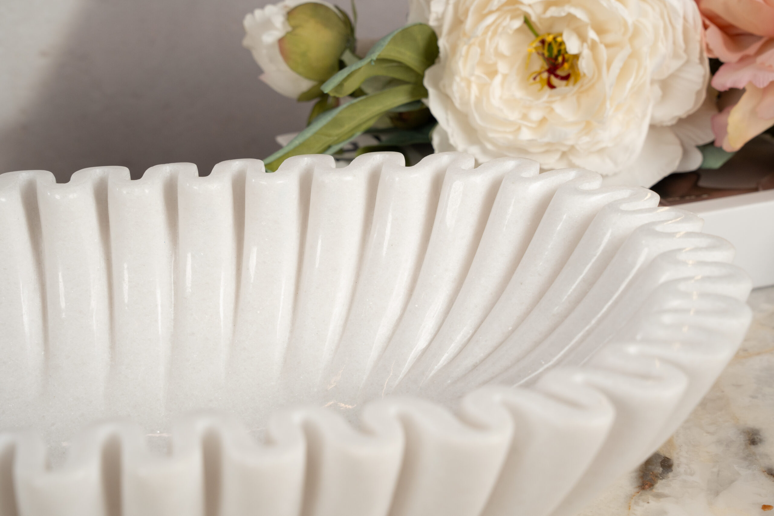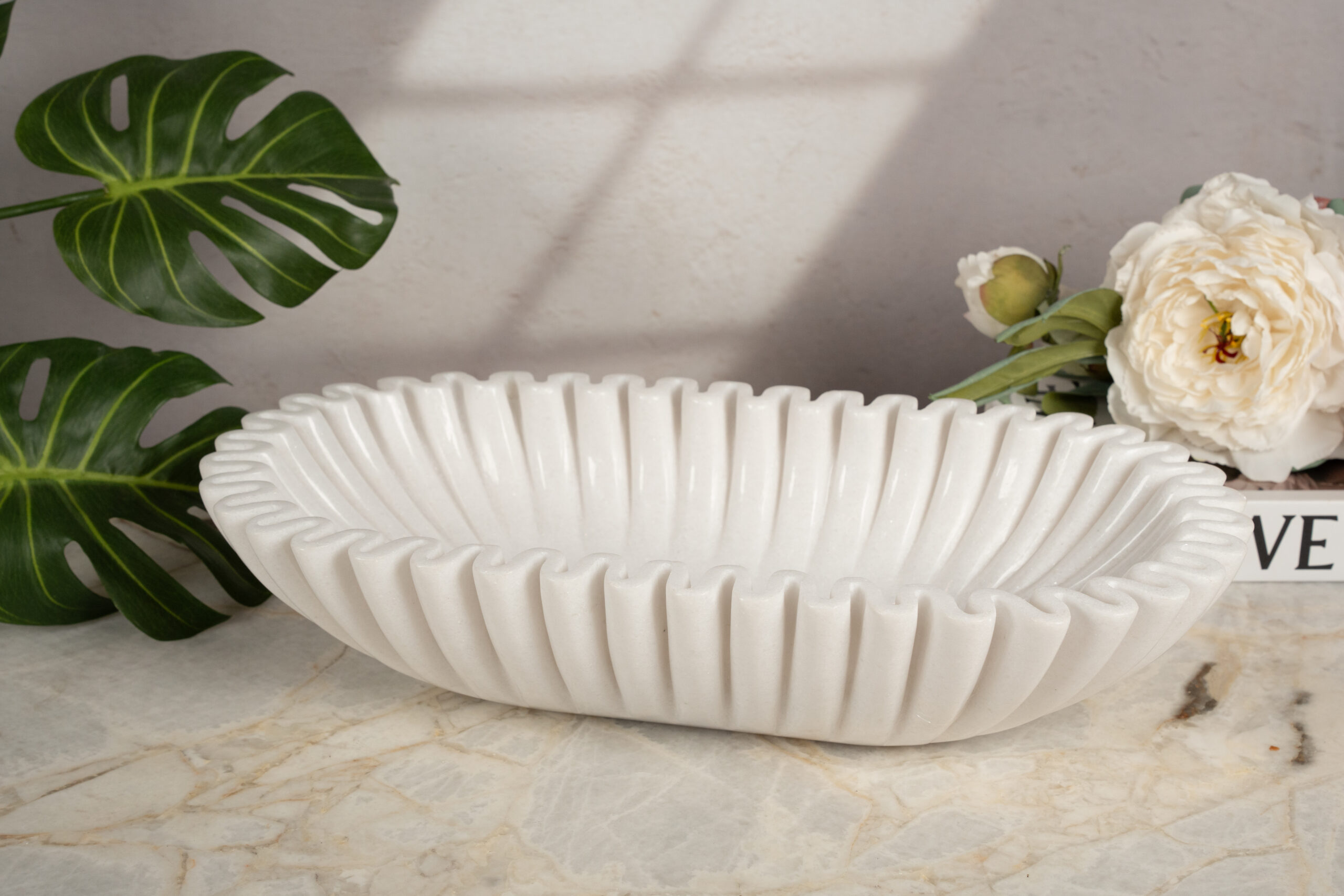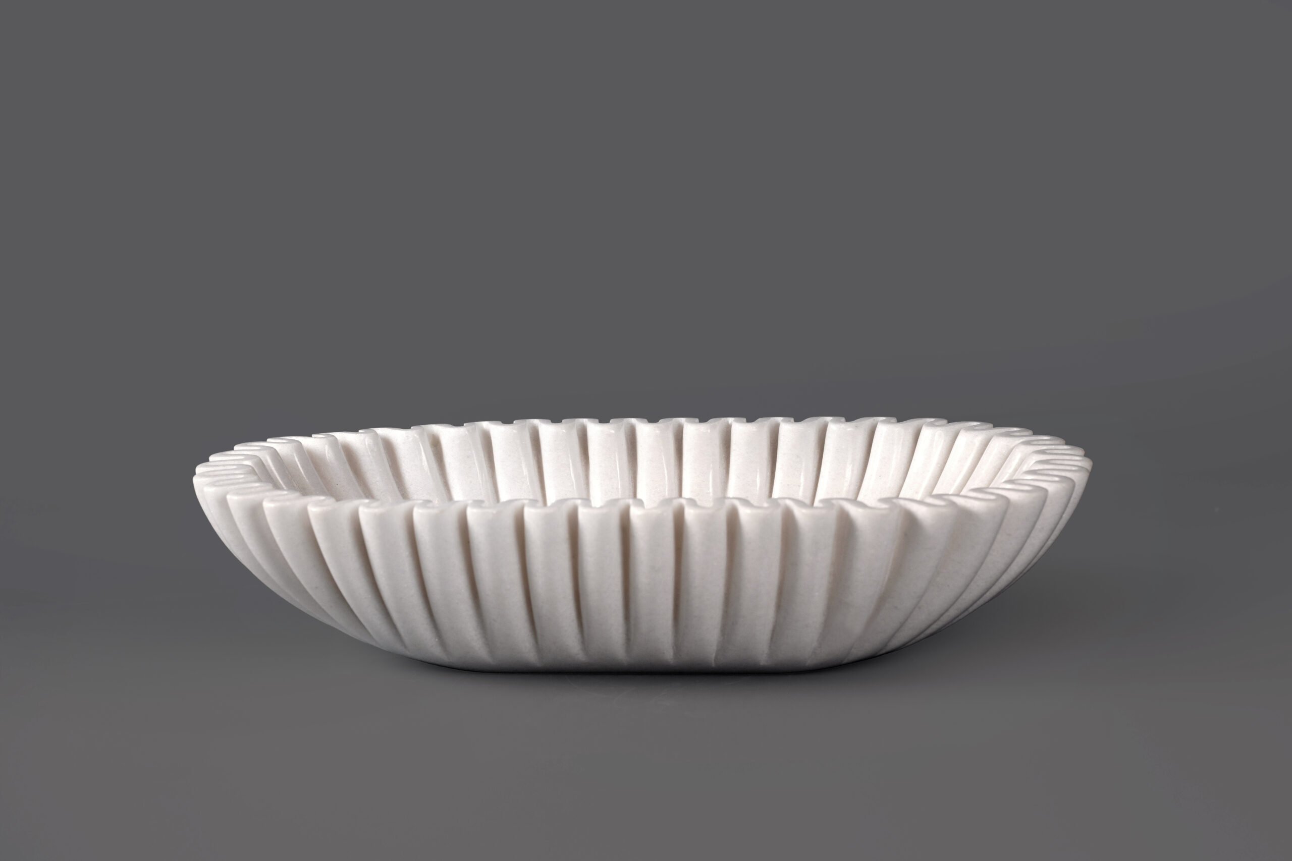 Barcione is a handcrafted artistic object sculpted from natural Snow White stone, distinguished by its pure white tone and finely balanced structure, featuring soft, evenly carved grooves that flow around the inner form to create a dynamic, fabric-like visual effect; meticulously shaped and polished by skilled artisans to preserve natural gloss while maintaining precise details, Barcione represents a refined fusion of traditional stone craftsmanship and contemporary aesthetics, making it a sophisticated decorative accent for luxury interiors such as living spaces, grand lobbies, and high-end showrooms, with overall dimensions of 220 × 450 × 100 mm.