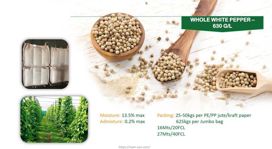 Export-Grade Whole White Peppercorns (630 g/L) are supplied for international buyers who require consistent bulk spice quality for processing, blending, and food manufacturing, featuring moisture ≤13.5% and admixture ≤0.2% for cleaner raw material input. Available in 25–50kg PE/PP jute/kraft paper bags or 625kg jumbo bags, this item supports efficient container shipments at 16MT/20FCL and 27MT/40FCL, making it suitable for scalable sourcing and export programs from Vietnam (origin details can be provided upon request).