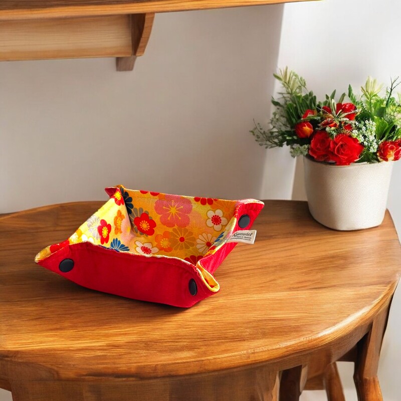 Made in Vietnam, this floral-pattern fabric organizer tray is fully handcrafted from printed fabric to neatly hold tissues, stationery, and small daily essentials, offering a practical and gift-ready textile accessory for international importers and B2B buyers sourcing handmade lifestyle products; size 8.5 × 8.5 cm, with slight color variations possible due to handmade production while keeping the same overall tone.