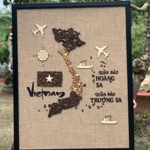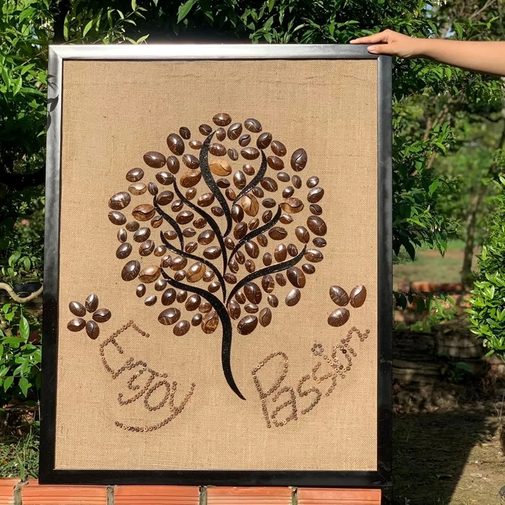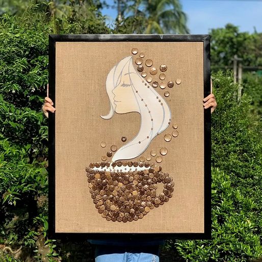 Made in Vietnam, this original hand-made decorative wall artwork features natural coconut shell material mounted on a wood support base with an elegant frame, offering a distinctive eco-friendly statement piece for interior décor sourcing (home décor retailers, hotels, cafés, offices) and bulk import orders.