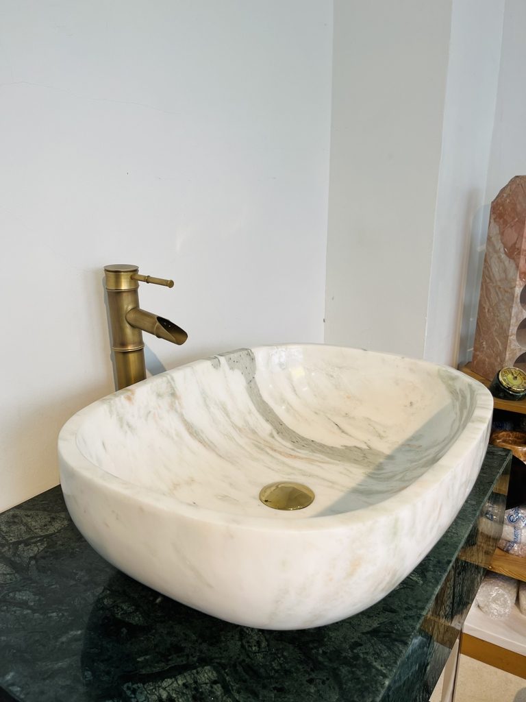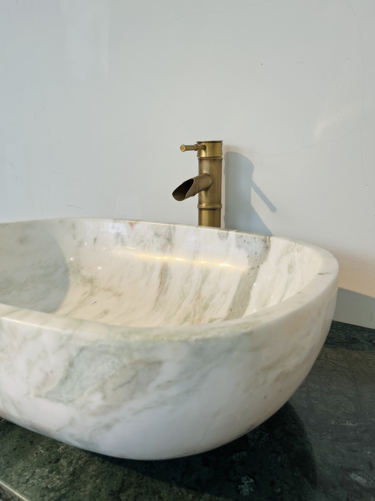 Model BST77 is a solid natural marble stone sink made in Vietnam in a premium Himalayan Green tone, featuring a large, heavy-duty build (H16 x 52 x 41 cm / 6.3 x 20.5 x 16.1 in) with approx. 26 kg (57.3 lbs) weight for excellent stability and long service life; ideal for hotel/resort projects, villas, and upscale residential bathrooms, supporting international importers and B2B buyers sourcing export-ready interior stone products with consistent finishing and reliable supply.