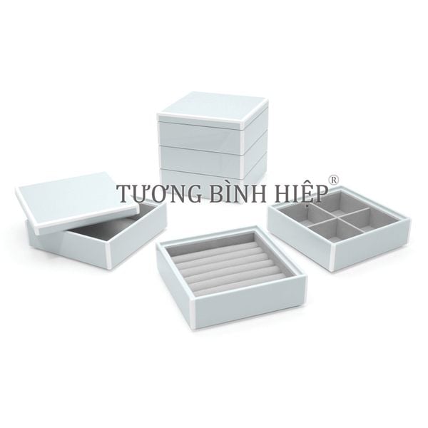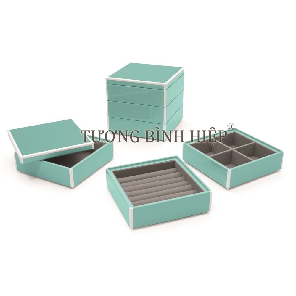 A Vietnam-made lacquer jewelry box designed for premium gifting and export sourcing. Featuring a 3-compartment layout with glossy lacquer exterior and velvet-lined interior to protect jewelry, built from CARB P2 MDF board for stable structure and OEM/ODM customization options.