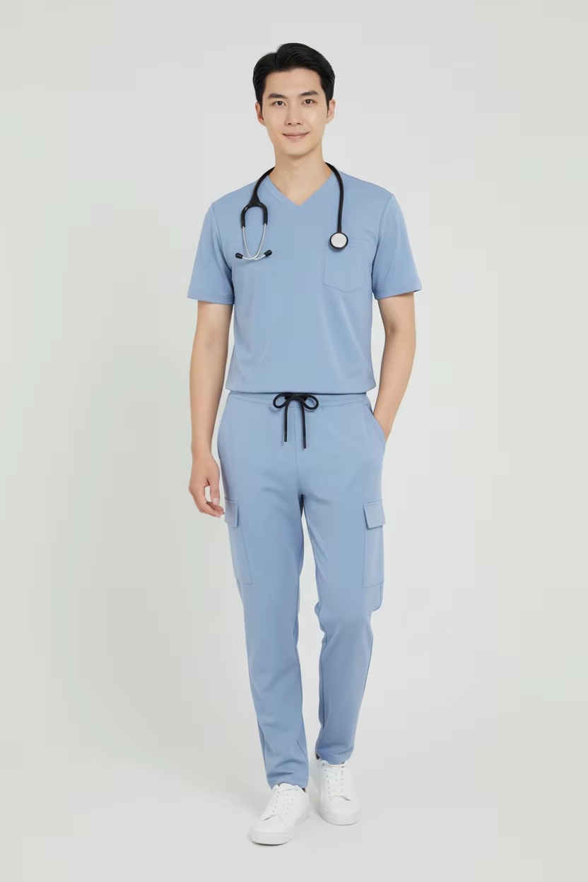 Designed for hospitals and healthcare uniform programs, this men’s medical scrub set features a breathable cotton-spandex knit for all-day comfort and easy movement. The set includes a modern V-neck short-sleeve top with chest pocket and functional cargo jogger scrub pants with multiple pockets—ideal for clinics, hospital chains, and importers sourcing reliable workwear. Produced in Vietnam, it supports bulk purchasing and customization for logo/branding and packaging based on buyer requirements.