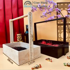 Made in Vietnam, this natural wood gift basket features a horizontal rounded carry handle and a sturdy rectangular frame to create premium Tet gift sets and corporate gift presentations; designed to securely pack items such as wine, cakes, jam jars, and local specialties, while remaining reusable for storage, décor setup, and product photo styling for B2B sourcing programs.